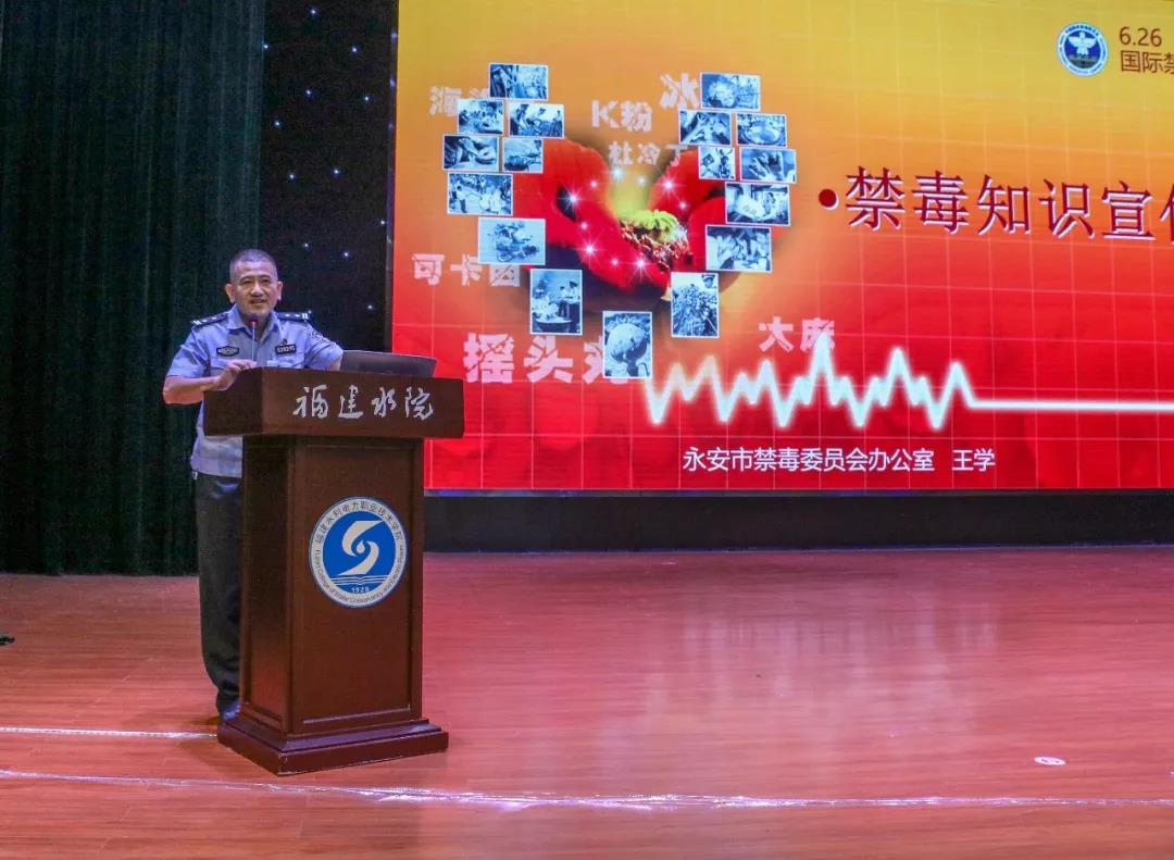 活动伊始,永安市政府副市长、市禁毒委常务副主任罗祥华带领全体参会人员进行了禁毒宣誓。永安市禁毒大队教导员王学在讲座中结合毒品犯罪案例,针对大学生的生理、心理特点,介绍了大学生吸毒的原因、吸毒后引发的多发性刑事治安案件的危害,以及大学生如何预防毒品犯罪等方面的知识,并号召同学们要树立正确的人生观、价值观,做一个有益于家庭、有益于社会、有益于国家的人。