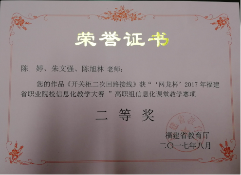 由福建省教育厅主办的“网龙杯”2017年福建省职业院校信息化教学大赛现场决赛于8月21日至23日在福建船政交通职业技术学院举行。电力工程系教师陈婷、朱文强、陈旭林的参赛作品《开关柜二次回路接线》获得信息化课堂教学二等奖,徐海英、聂英斌的参赛作品《异步电动机单相起动控制线路》获得信息化课堂教学三等奖。