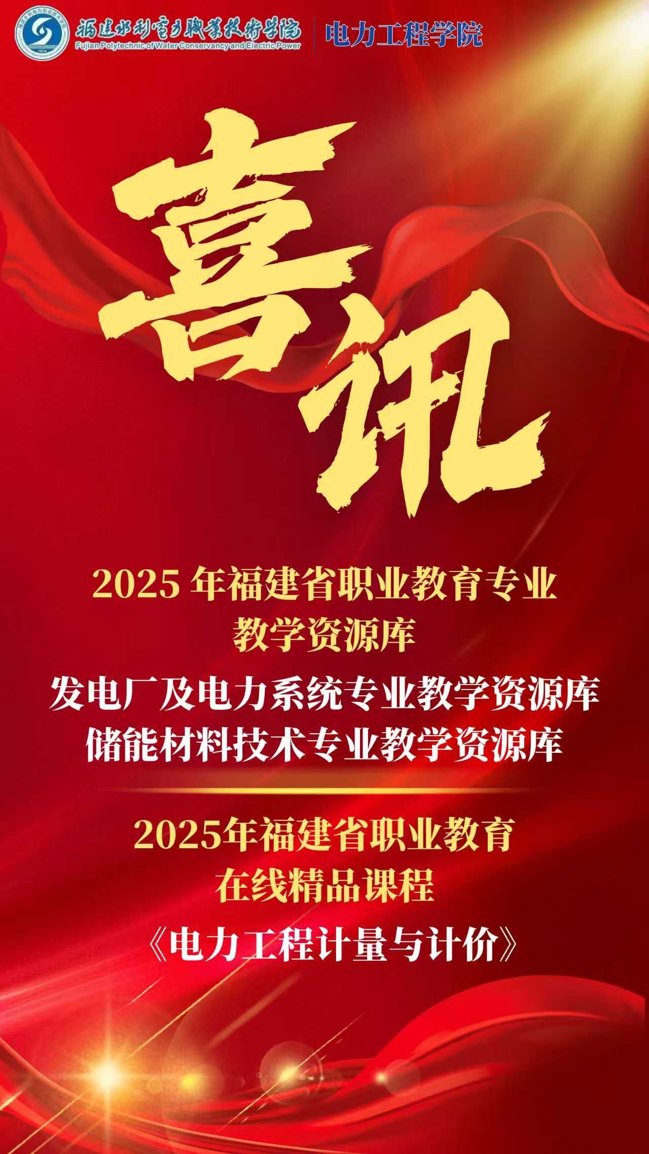 近日,我院“发电厂及电力系统”“储能材料技术”两大专业教学资源库,与《电力工程计量与计价》课程,分别成功入选福建省职业教育专业教学资源库与福建省职业教育在线精品课程。