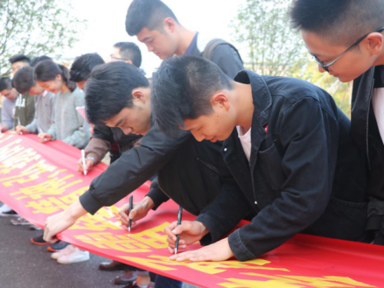团总支书记许培德老师宣读了《关于开展2018年学雷锋青年志愿服务活动的通知》方案,号召广大师生大力弘扬志愿服务精神,拓展学习雷锋活动平台,在奉献中体现作为,在付出中提升境界,在实践中传播文明,营造团员青年踊跃参与志愿服务的良好氛围,赋予雷锋精神新的时代内涵。随后,学生代表做表态发言,现场志愿者宣誓。志愿者们在“传承雷锋精神,弘扬时代新风”的条幅上签名,并表示会积极参加志愿服务活动,传承雷锋精神。