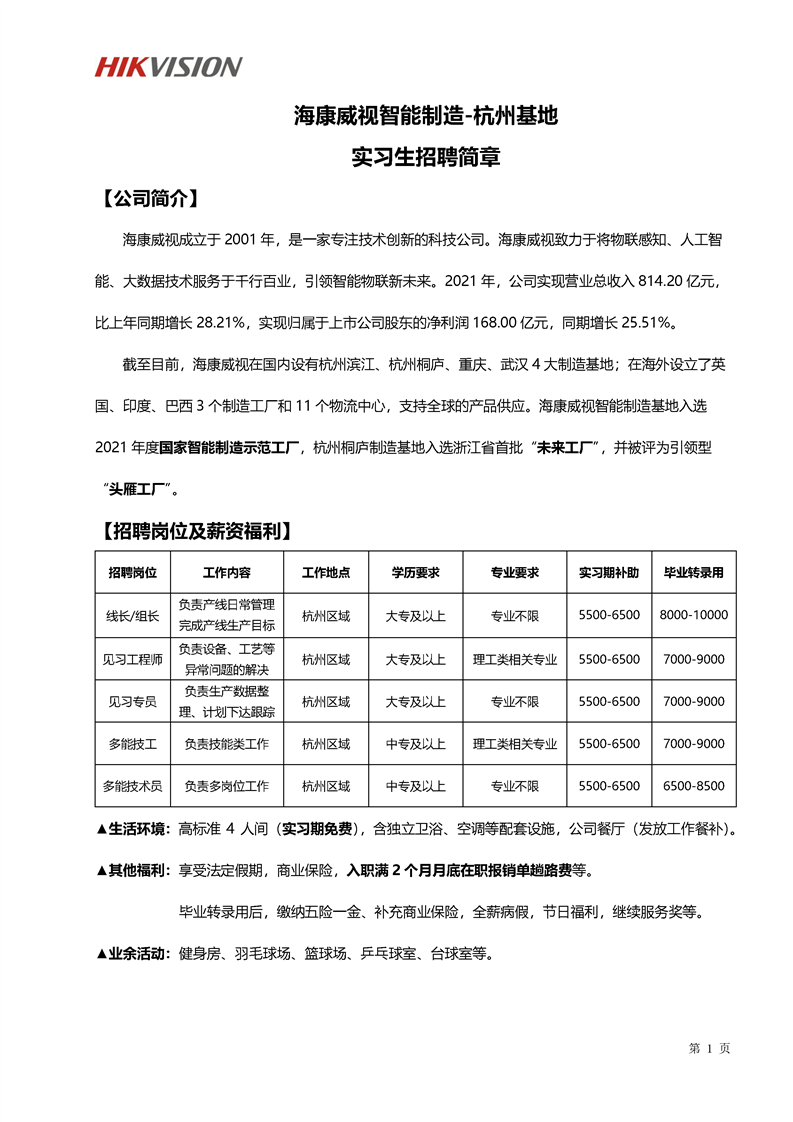 杭州海康威视电子有限公司2022年招聘简章