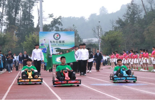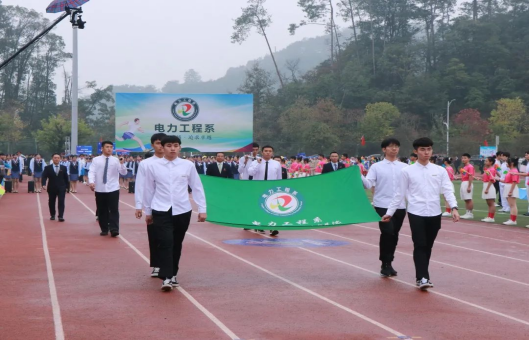 田径场内,彩球飞扬,装扮一新展现出青春欢腾的景色。伴着激昂的音乐,电力工程系代表队方阵踏着有力的步伐,高喊口号,以饱满的热情、富有创意的形式一一入场。
