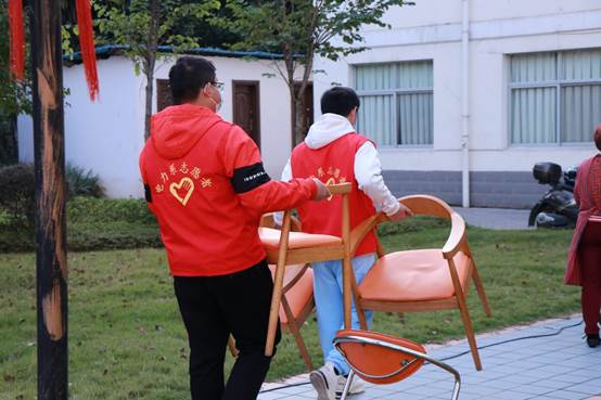 志愿者们将桌子椅子搬回到室内摆放整齐,并仔细清理了养老院各个角落、草丛里不起眼的垃圾。