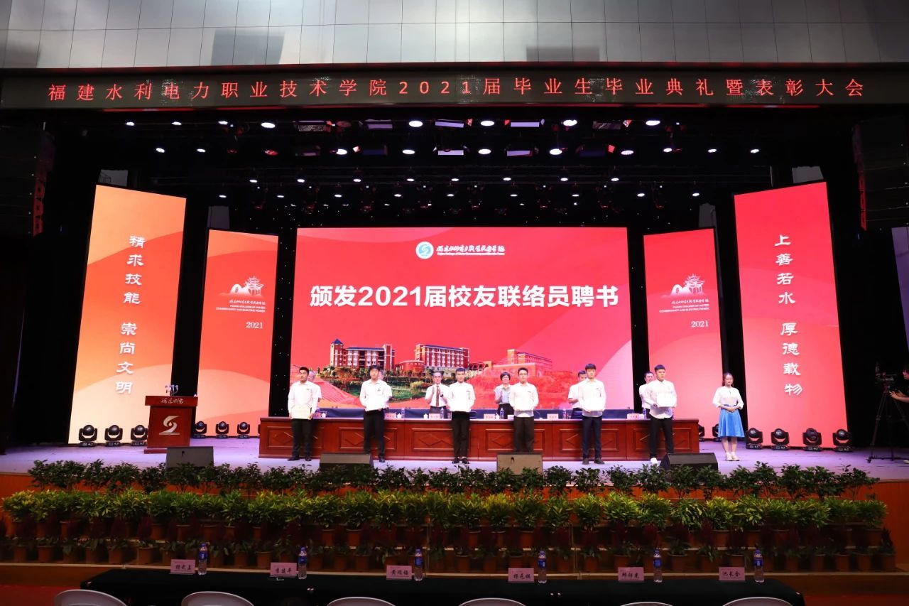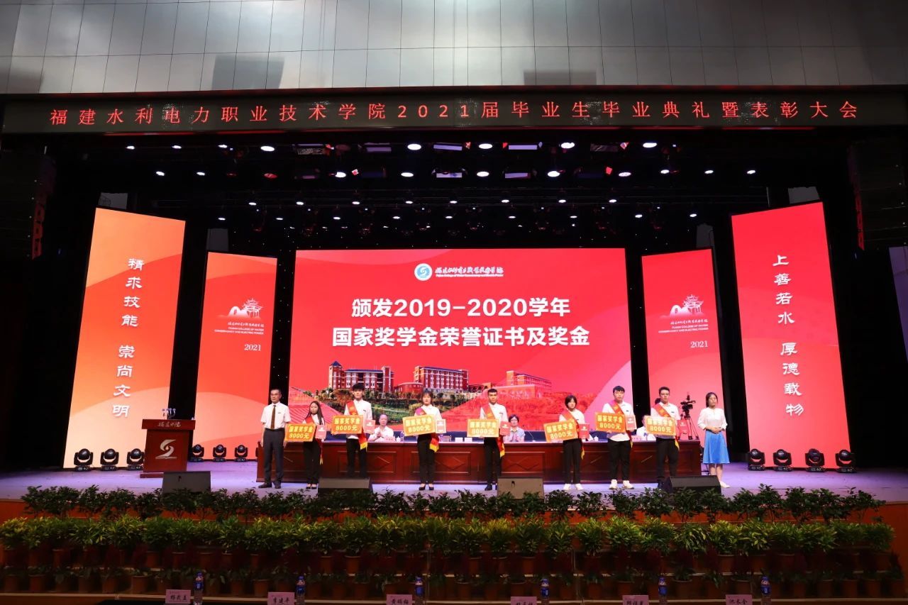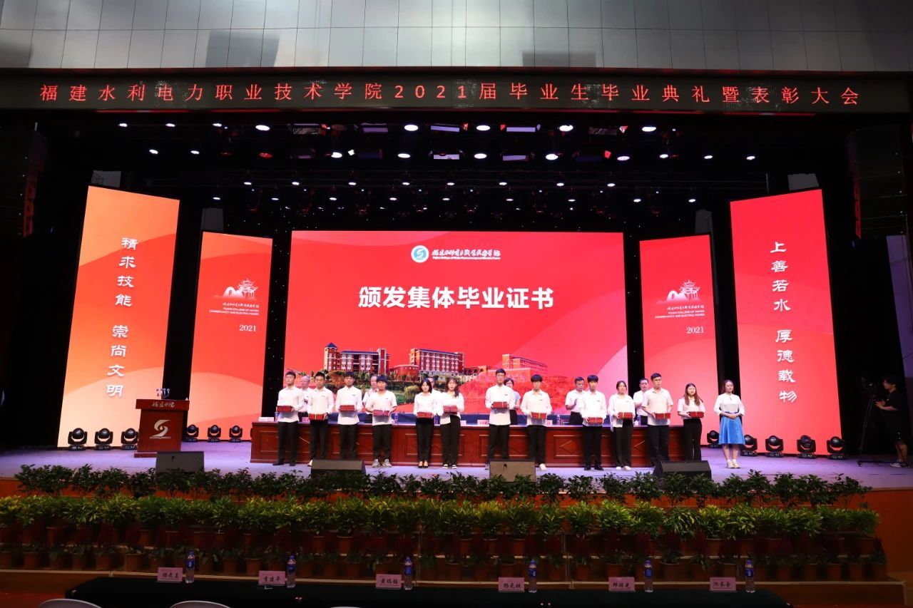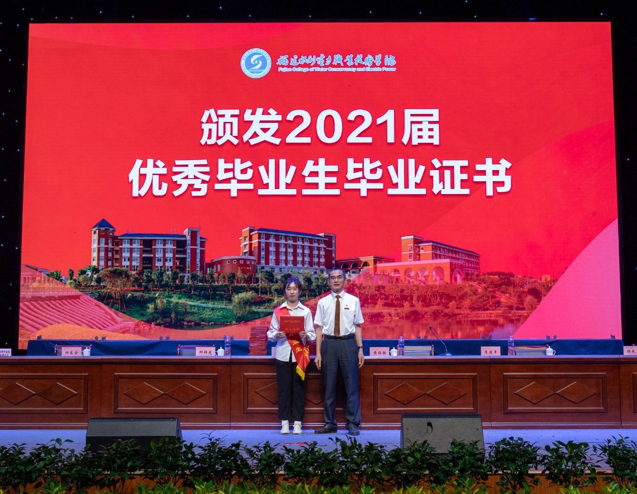 黄瑞梅宣读了《2021届校友联络员聘任文件》《2021届优秀毕业生表彰决定》和《2019-2020学年国家奖学金的通知》。主席台领导分批次颁发了2021届校友联络员聘书、2021届优秀毕业生荣誉证书、2019-2020学年国家奖学金荣誉证书及集体毕业证书。此外,杨元挺还依次为每一位优秀毕业生颁发了毕业证书并合影留念。希望他们永志不忘“精求技能 崇尚文明”的校训,珍惜这个伟大的新时代,珍惜人生难得的新机遇,志存高远、脚踏实地,不畏艰难险阻,勇担时代使命,把个人理想追求融入党和国家事业中,为党、为祖国、为人民多作贡献。