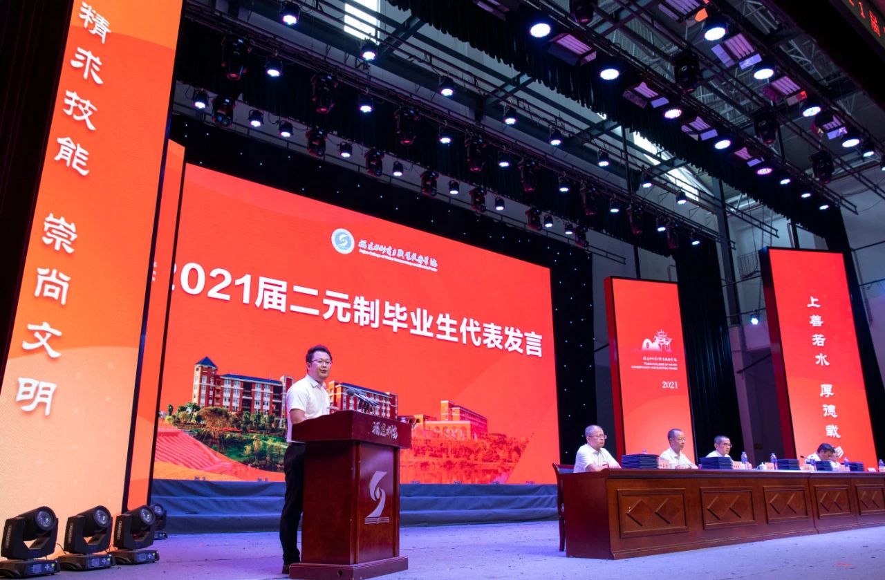 测量1831(伟志班)学生李振麟代表2021届全体二元制毕业生致辞,三年来他和同学们都特别珍惜这次难得的学习机会,一边工作、一边学习,专业技术及职业素养得到明显提升,他还表达了对学院领导老师以及所在企业的感谢,祝愿学院的明天更美好!