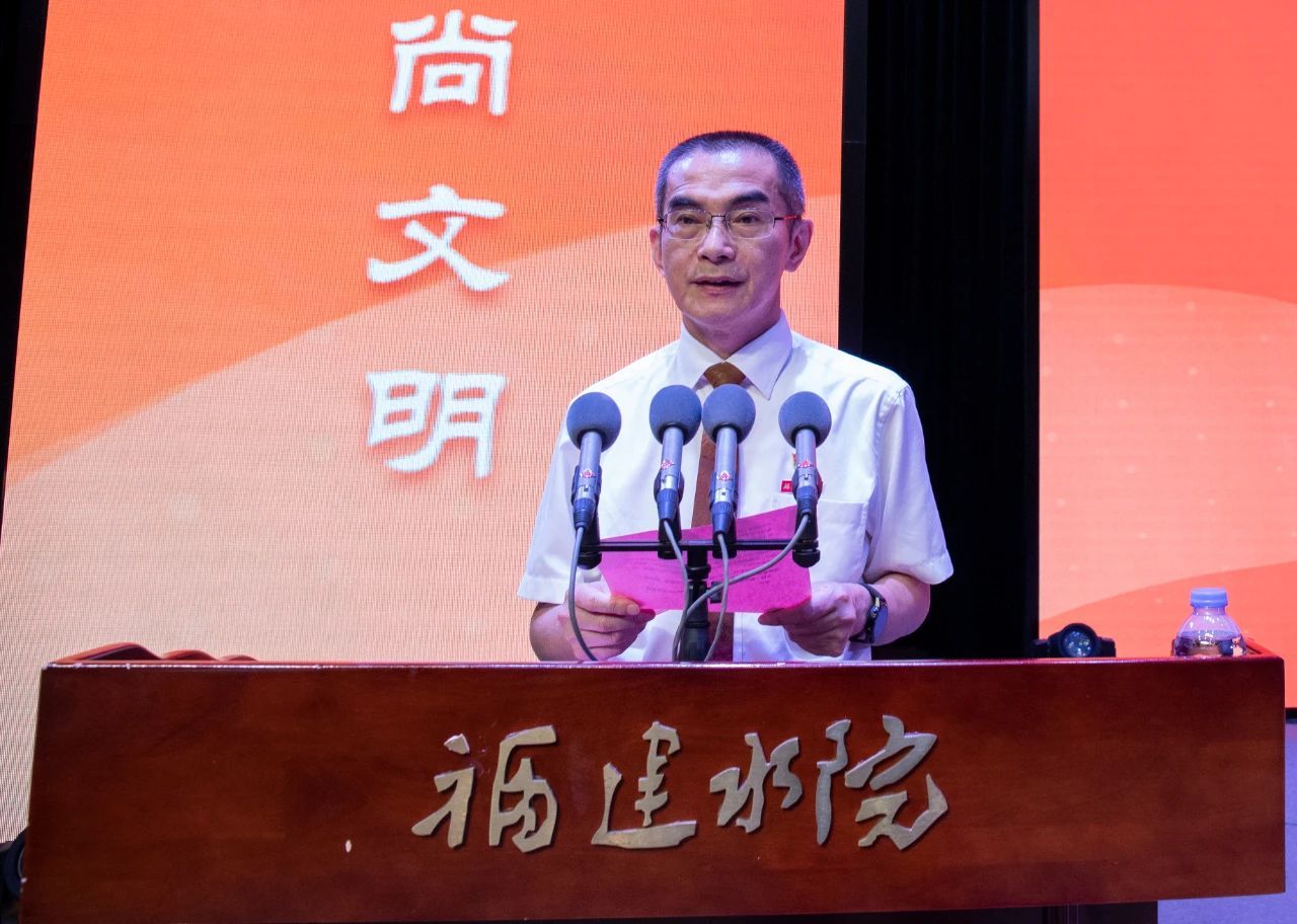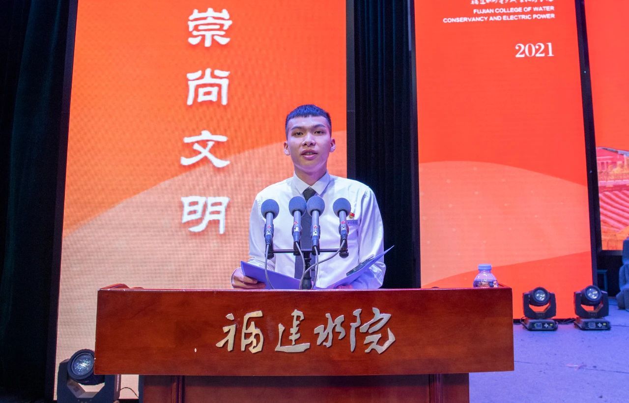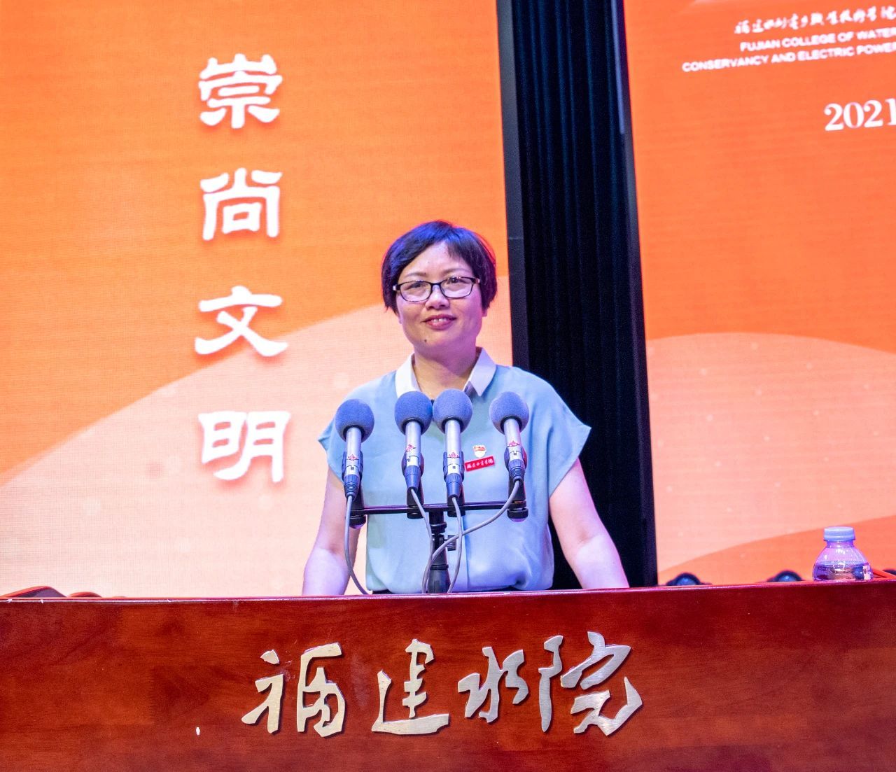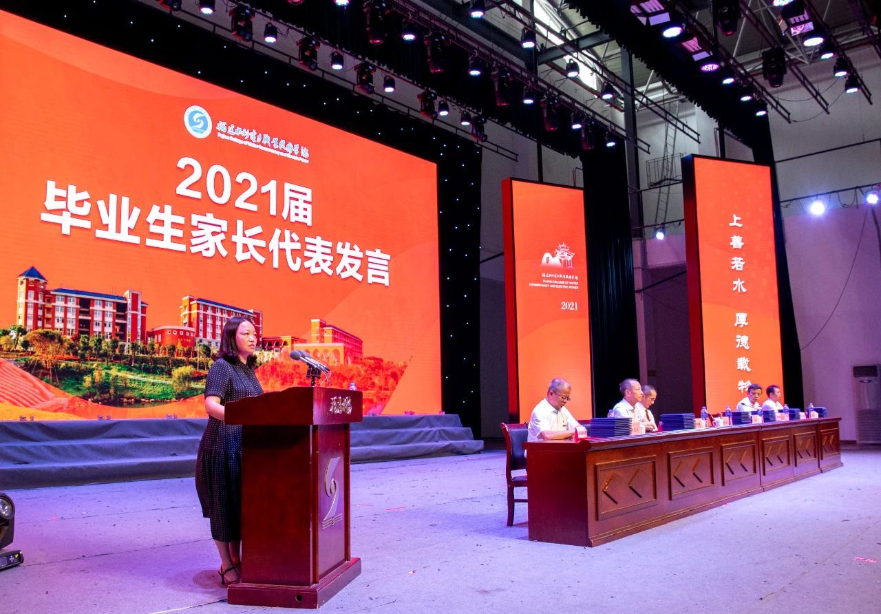 2021届毕业生家长代表、会计1832班黄翔宇的母亲陈清女士分享了自己见证孩子在学院的成长和蜕变。她动情地说:“这三年,他变得更加独立、果敢,有责任、有担当。无论是个人素养还是专业水平,都远远超出我的预想。”为儿子在福建水院求学成功而庆幸、骄傲和欣慰。