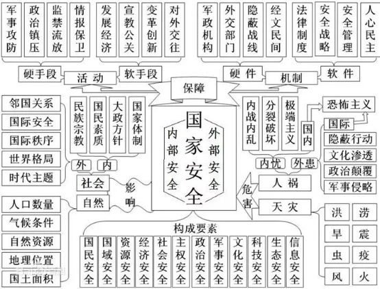 国家安全是指国家政权、主权、统一和领土完整、人民福祉、经济社会可持续发展和国家其他重大利益相对处于没有危险和不受内外威胁的状态,以及保障持续安全状态的能力。国家安全包括16个方面的基本内容:政治安全、国土安全、军事安全、经济安全、文化安全、社会安全、科技安全、网络安全、生态安全、资源安全、核安全、海外利益安全、生物安全、太空安全、极地安全、深海安全。