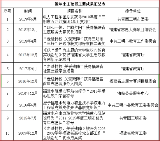 福建水院电力工程系坚持立德树人,德育为先,将志愿服务文化作为大学文化精髓加以培育,将志愿服务精神作为大学精神内涵予以弘扬,将志愿文化与时代精神相结合,大力弘扬中华传统美德,培育和践行社会主义核心价值观,滋润学生精神家园,找到了一条实践育人与文化育人相结合的有效路径。