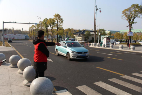 动车站外的马路,一辆辆汽车呼啸而过。交通工具日新月异,为了便捷,现在大多人出行使用出租车、“滴滴”等交通工具。这类交通工具具有时效高的特点,备受人们青睐。我班志愿者正指挥着交通,劝阻出租车司机的车辆不要乱停乱放。