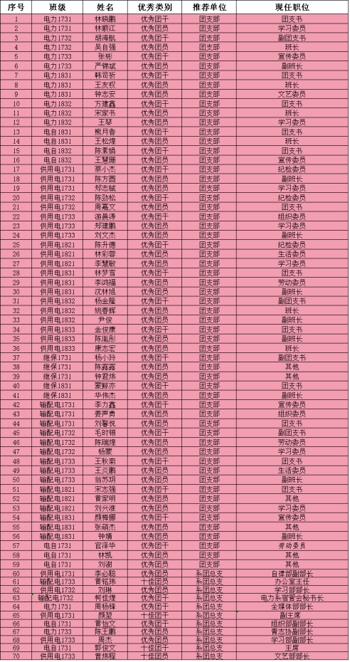 电力工程系2018年度优秀团员、优秀团干、十佳团员、十佳团干、先进集体评选结果如下: