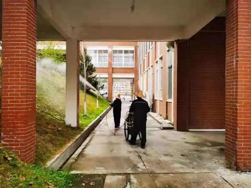 工作人员带着对全体师生高度负责的态度,细心的完成各个地方的消毒工作,筑牢校园卫生安全防线。