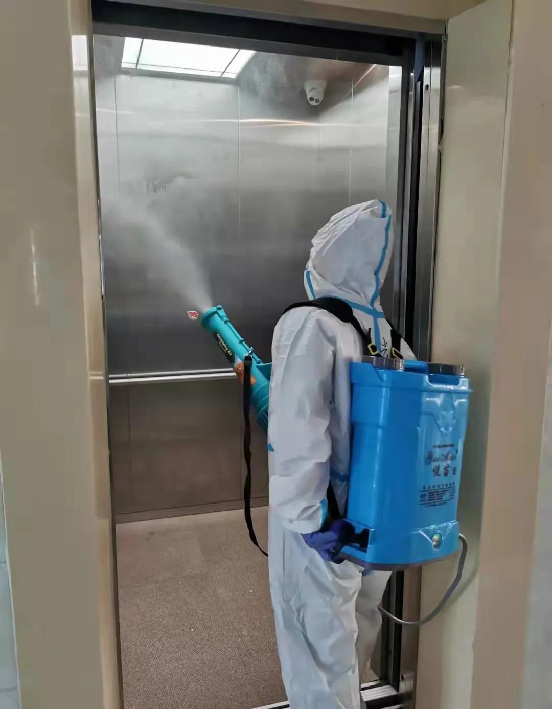 消杀过程中,救援队的队员们身穿工作服、佩戴口罩,在高温天气下背着沉重的专业消毒设备,按比例配好消毒液,严格按照规范流程要求,对学校图书馆、食堂、电梯、走廊、楼道等重点区域进行了彻底的、全方位、无死角的全面喷洒消毒。