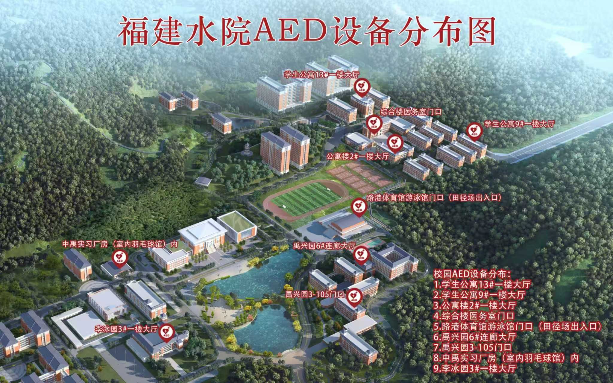 学校还公布最新版《福建水院AED设备分布图》,标注9处AED配置点,覆盖教学楼、操场、宿舍等人员密集区域。