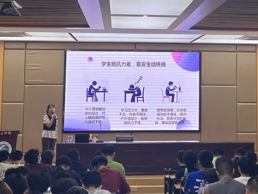 其次,由疾控中心结核病防治科科长张晶以《终止结核,乐享新生》为主题,深入浅出地介绍结核病的发病机制、传播途径、临床症状以及预防和治疗方法等,强调青少年由于学习压力大,睡眠不足导致免疫力减弱,是结核病的易感人群。