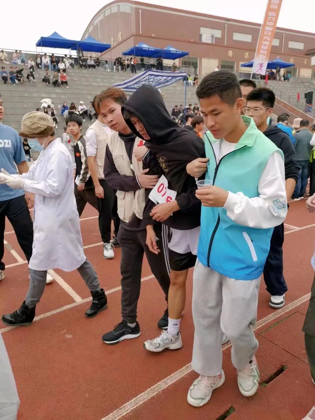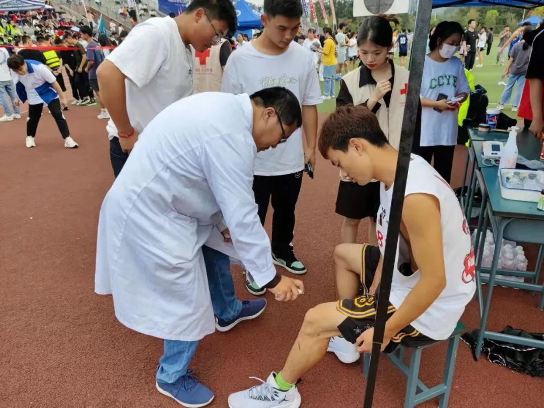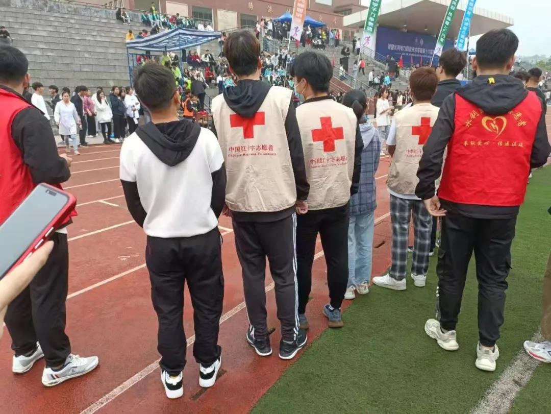 身穿红十字马甲的志愿者们也早早等待在赛场边,建起了志愿服务点,准备好应急救护物质,分配好每位志愿者的工作任务,力求全方位保障参赛人员的安全。他们坚守本分,为受伤的运动健儿做好健康守护,并贴心地准备好了葡萄糖水,以保证同学们能安全健康的度过此次运动会,为本届校运会保驾护航。