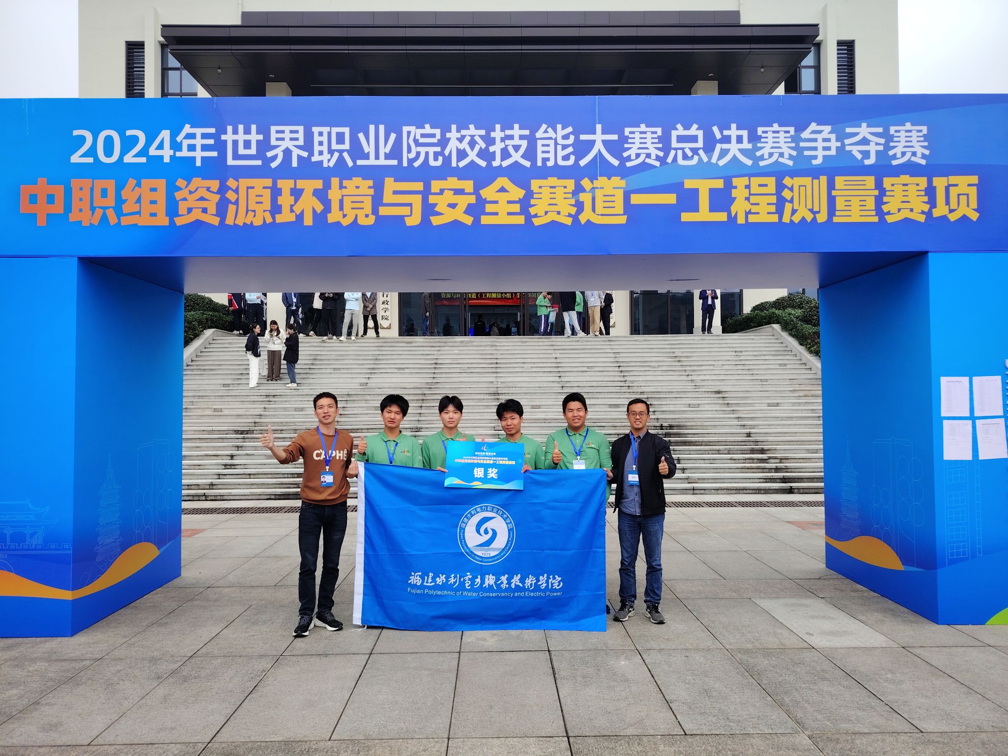 2024年10月26日至29日,2024年世界职业院校技能大赛总决赛争夺赛资源环境与安全赛道工程测量小组赛在浙江省绍兴市举行,来自全国各地中职院校的 68 支代表队、共 268 名选手展开了激烈角逐。我校范文锋、林锦松、段志林、庄跃盛四位同学组成的参赛队伍,在指导教师林念祥和曹龑的带领下,荣获国赛银奖。