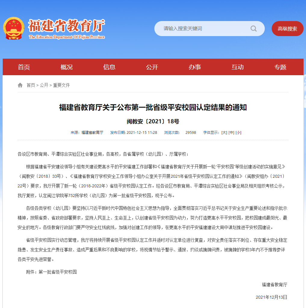 近日,福建省教育厅公布第一批省级平安校园认定结果,我院成功入选第一批省级平安校园。