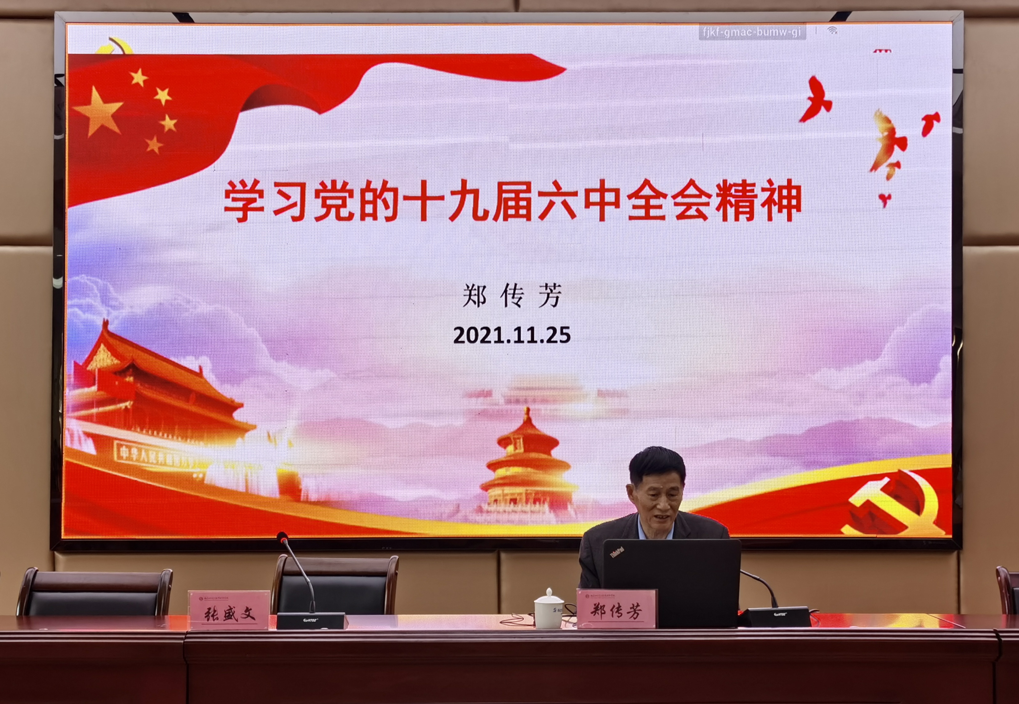 郑传芳从深刻认识总结党的百年奋斗重大成就和历史经验的重大意义、深刻认识党的百年奋斗的初心使命和重大成就、深刻认识中国特色社会主义进入新时代的历史性成就和历史性变革、深刻认识党的百年奋斗的历史意义和历史经验、深刻认识以史为鉴,开创未来的重要要求、从党的百年奋斗历程中汲取智慧和力量六个方面,对六中全会精神作了深入解读。