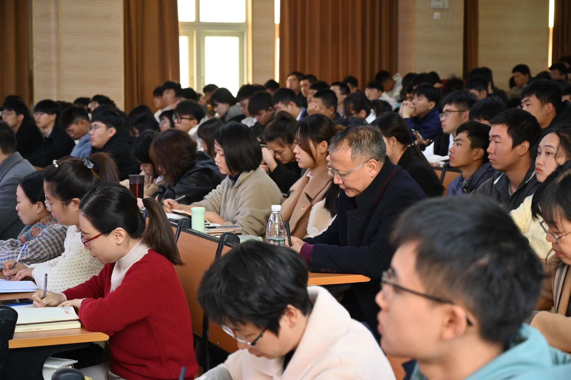 11月25日上午,中央马克思主义理论研究和建设工程首席专家、全国高校教学指导委员会马克思主义理论类专业委员会委员、全国高校思想政治理论课教学指导委员会委员、学院外聘教授郑传芳,应邀到我院做《学习党的十九届六中全会精神》专题宣讲。马克思主义学院院长张盛文主持,全体思政专兼职教师及习近平新时代中国特色社会主义思想读书社社员和学院“青马工程”学子参加讲座。