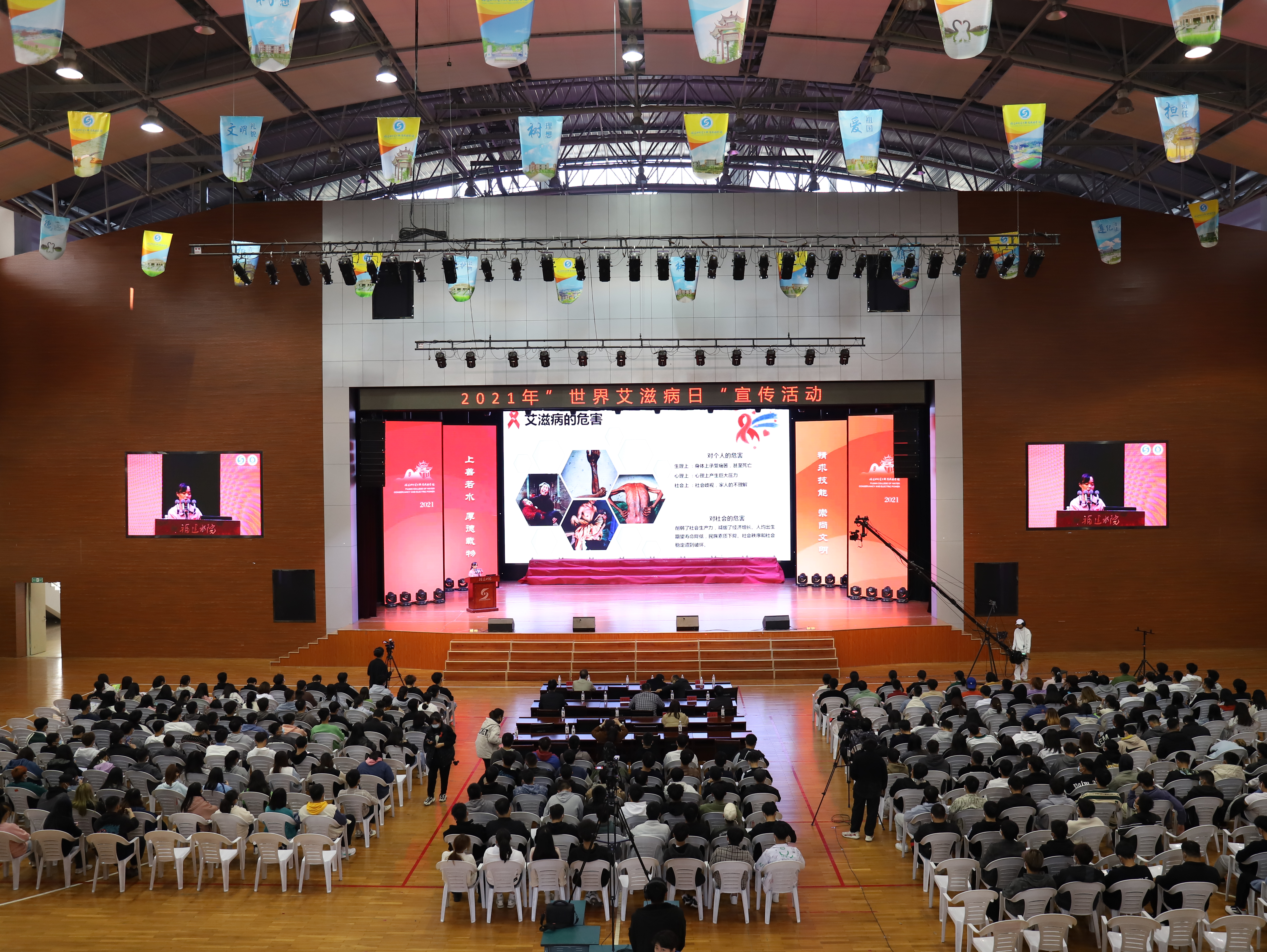 第34个世界艾滋病日来临之际,为牢固树立“健康第一”的教育理念,深化新时代学校卫生与健康教育,11月30日下午,以“生命至上 终结艾滋 健康平等”为主题的宣教活动在我院路港体育教学馆举行。此次宣教活动由我院联合永安市卫生健康局、永安市总工会、永安市红十字会、永安市防治艾滋病工作委员会、三明市永安总医院、永安市疾病预防控制中心等单位举办。学院副院长李建平,永安市卫健局副局长赖建华以及相关单位领导来宾及师生共计2500 余人参加活动。
