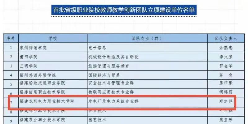 根据《福建省教育厅关于印发福建省职业教育教师教学创新团队建设方案的通知》(闽教师〔2020〕47号),我院申报的发电厂及电力系统专业群教师教学创新团队获批立项,郑志萍教授任团队负责人。