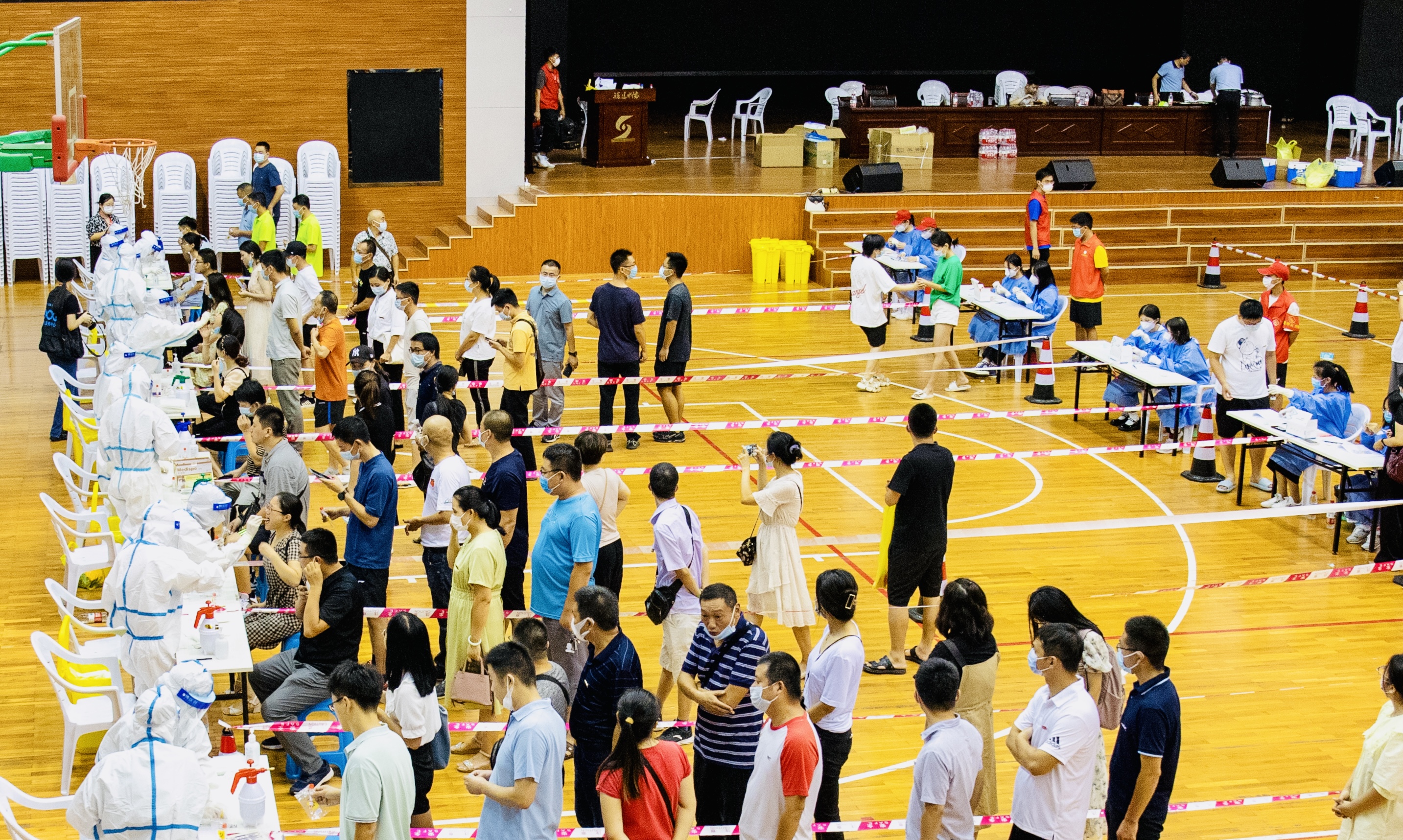 9月13日下午,学院防控疫情工作领导小组立即与永安市疫情防控指挥部、永安市卫健局、永安市总医院等部门联系,立即安排部署学院全员核酸检测工作,在路港体育馆及综合楼共设置50个核酸检测采样点。采样现场,全体师生首先领取检测条形码,分“十人一组”,按照防疫要求保持安全间隔距离依次进行采样。采样现场实行单口进入、单口离开,人员不交叉,采样结束后师生迅速离开现场。