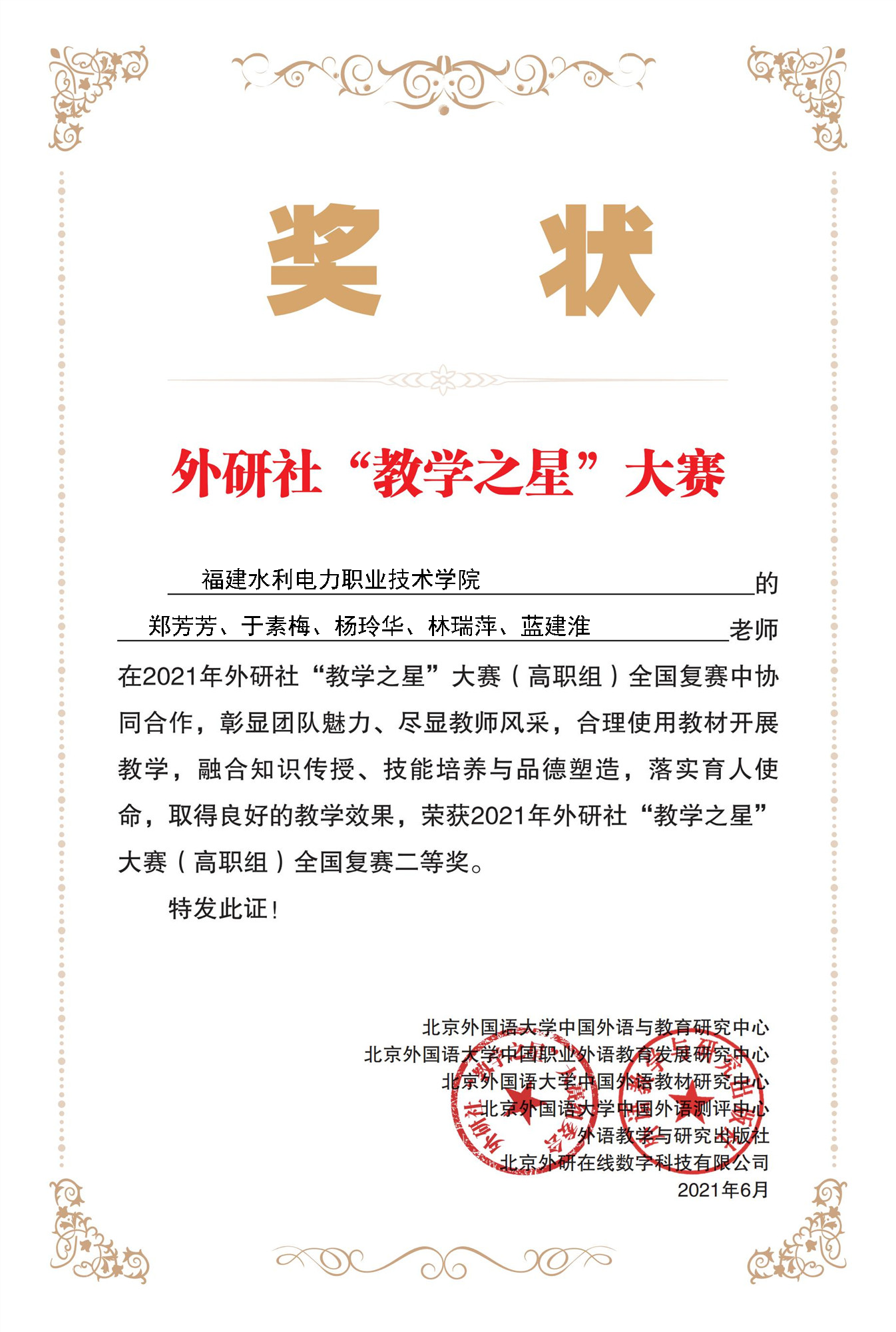 近日,由教育部高等学校大学外语教学指导委员会、教育部高等学校英语专业教学指导分委员会、外语教学与研究出版社共同主办的2021外研社“教学之星”大赛落下帷幕。此次大赛共有157所高职院校参加,创历年新高。由学院公共基础部英语教研室郑芳芳、杨玲华、林瑞萍、蓝建淮、于素梅5位老师组成的教学团队荣获全国复赛二等奖。