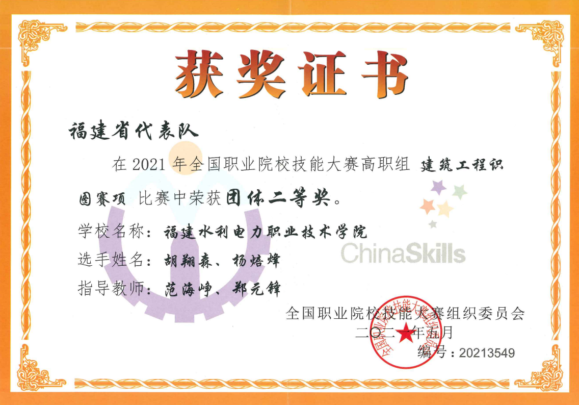 近日,2021年全国职业院校技能大赛高职组“建筑工程识图”赛项在山东日照顺利举办。本次赛项由教育部等36部门主办,山东省教育厅和日照市人民政府联合承办,来自各省、自治区、直辖市、新疆生产建设兵团的32个代表队64名选手参加。建筑工程系范海峥、郑元锋老师指导,胡翔森(造价1936班)、杨焙烽(建筑1931班)两位学生组成福建省唯一一支代表队,以全国第六名的总成绩荣获建筑工程识图赛项二等奖。