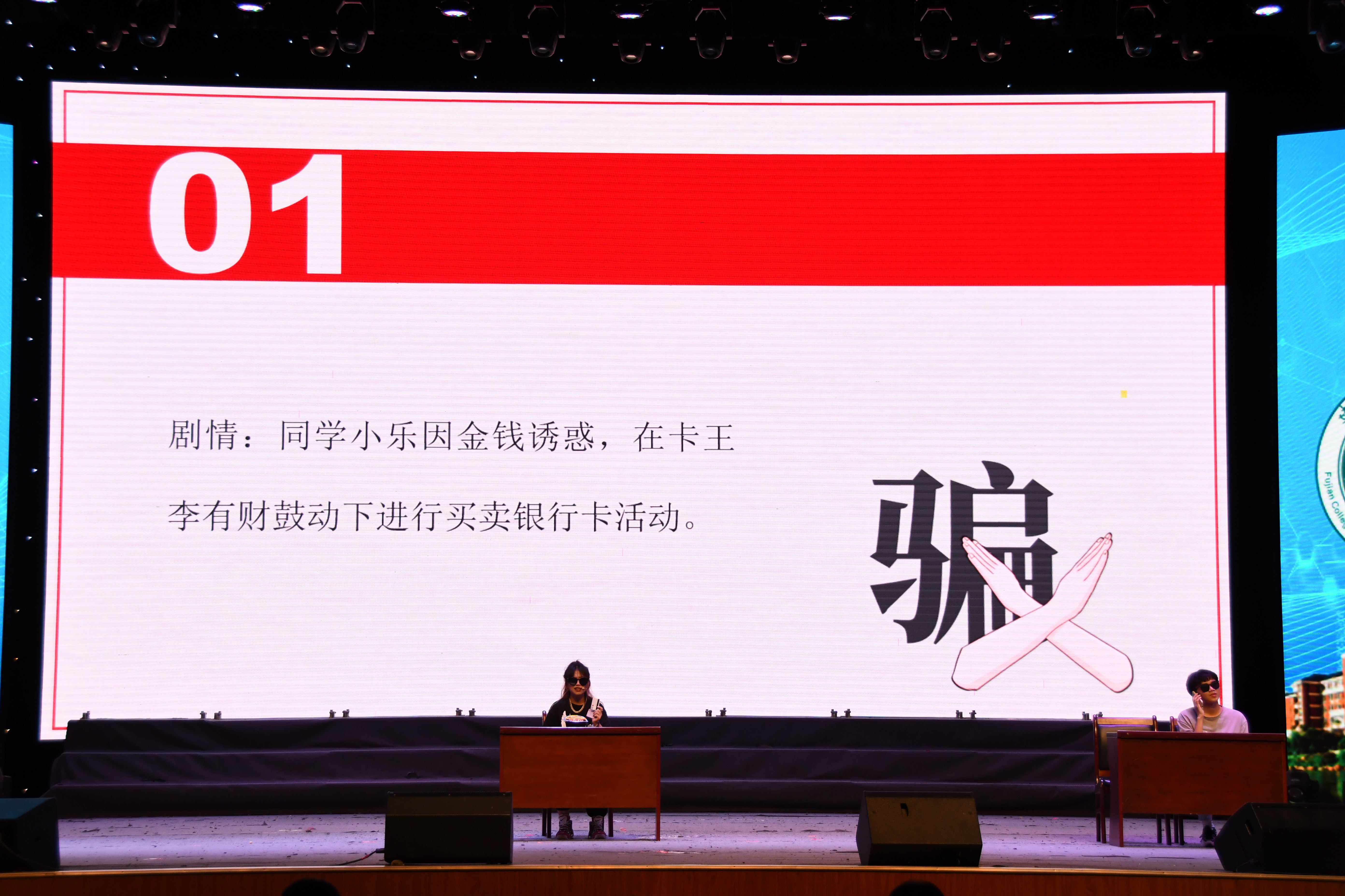 由学生自编自导的《断卡行动》《被贷走的那一天》《一夜暴“负”》《诈骗局中局》《真假老师》《虚假致富路》等丰富多彩的情景剧,再现了当前大学生被诈骗的诸多真实案例。演员们倾情演绎,展示形式多样的诈骗手法,并将被骗时的心理呈现得淋漓尽致。全体师生还进行了现场集体宣誓,以铿锵有力的声音承诺共同预防诈骗,将本次活动推向高潮。