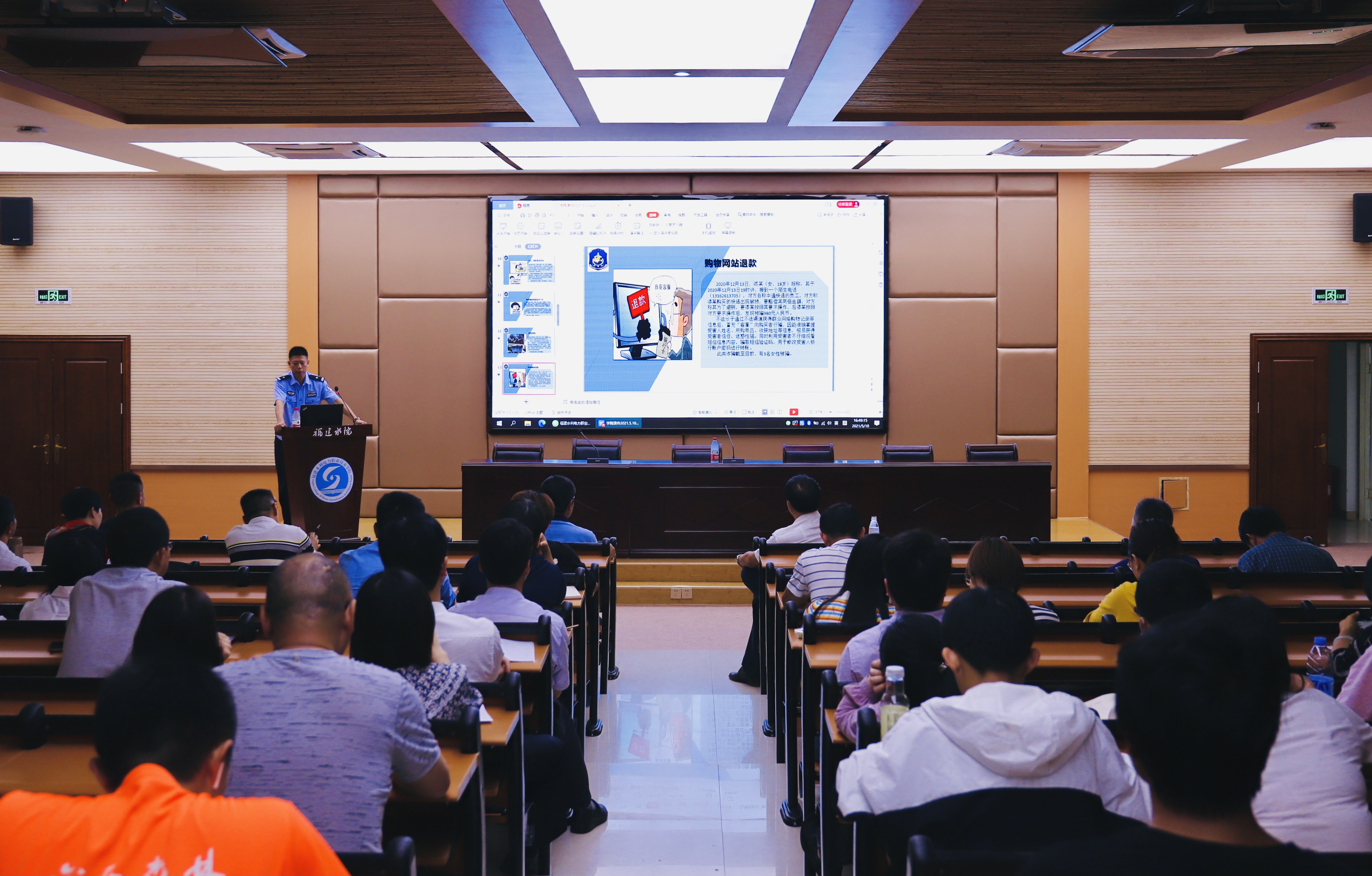 刘叶波从当前电信网络诈骗形势、学院电信诈骗案发情况、常见的几类电信网络诈骗类型、如何防范电信网络诈骗等四个方面做了专业的反诈宣传,对我院师生如何做好反诈工作提出了具体的指导意见。