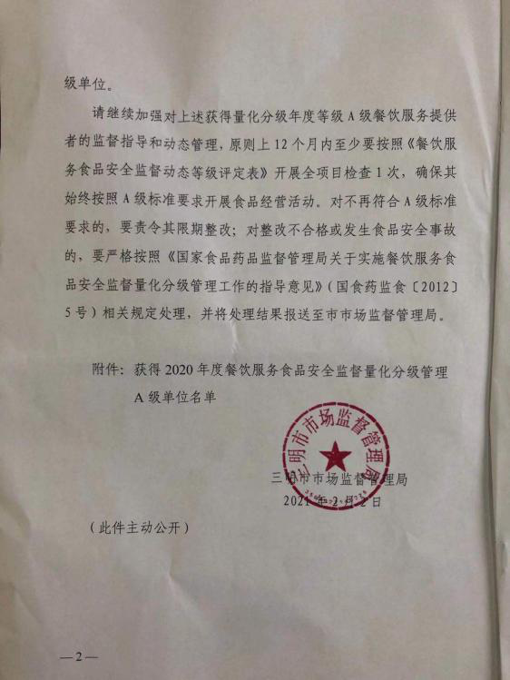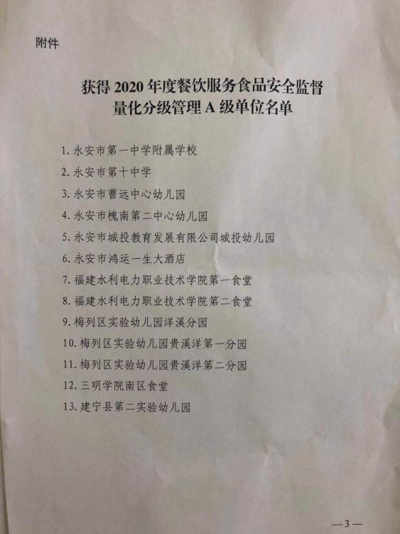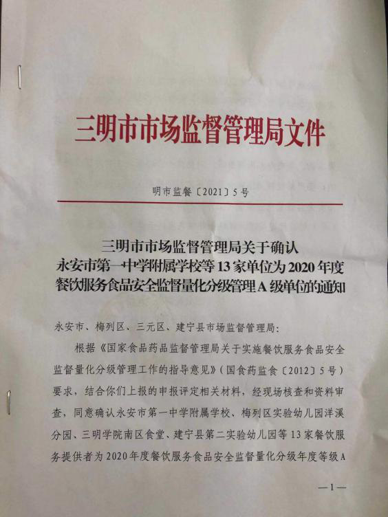 日前,据三明市市场监督管理局印发《关于确认13家单位为2020年度餐饮服务食品安全监督量化分级管理A级单位的通知》(明市监餐〔2021〕5号)悉,我院第一、第二食堂顺利通过餐饮服务食品安全等级A级的认定,获评三明市“A级食堂”。