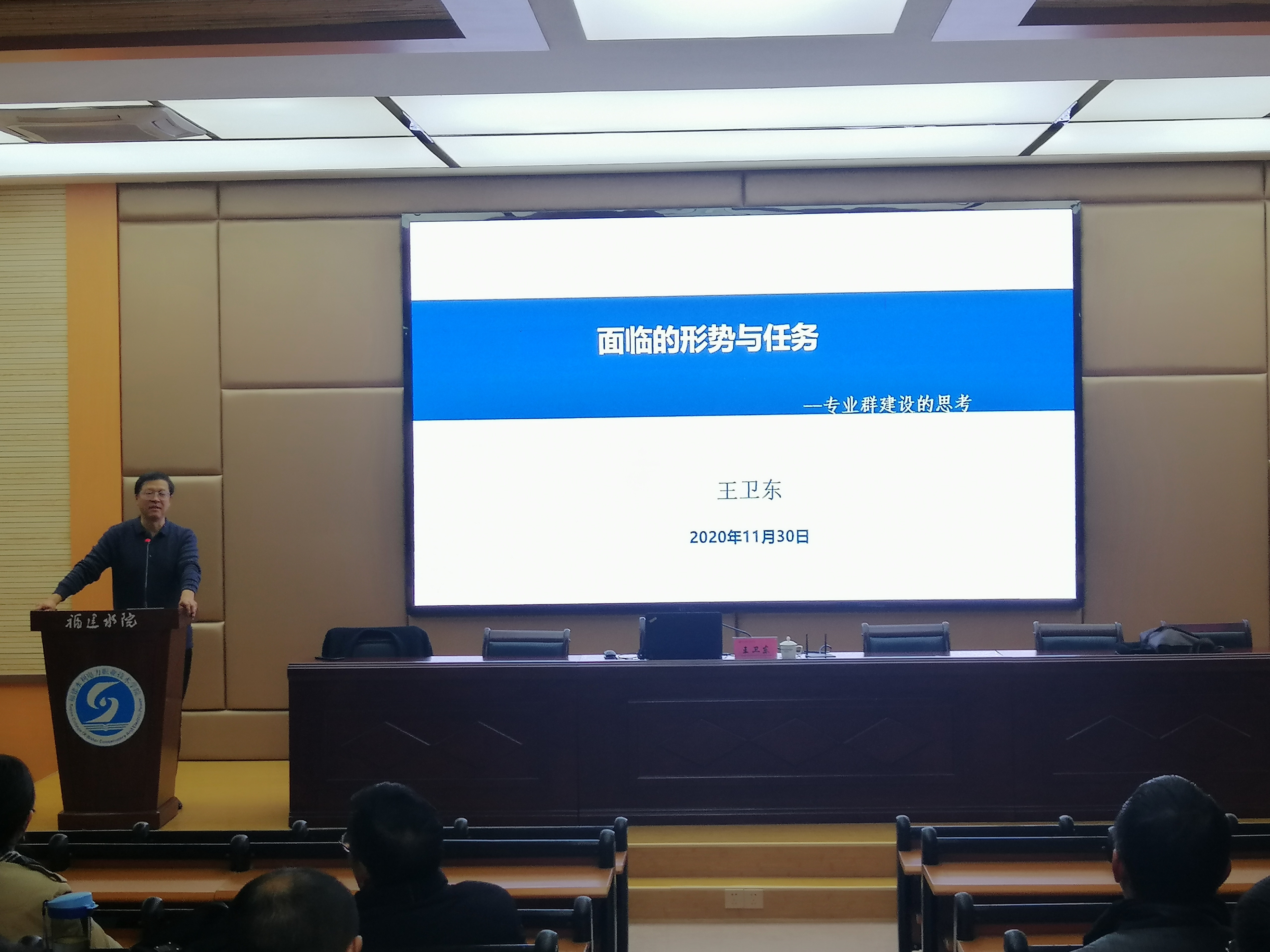 11月30日下午,我院邀请黄河水利职业技术学院王卫东教授作“双高校建设下学院面临的形势与任务”专题讲座。讲座在第一学术报告厅举行,副院长杨武盖出席,各系主任、副主任、专业带头人、骨干教师、教研室主任、副主任及教务处相关人员共同参加。教务处处长包晓晖主持讲座。
