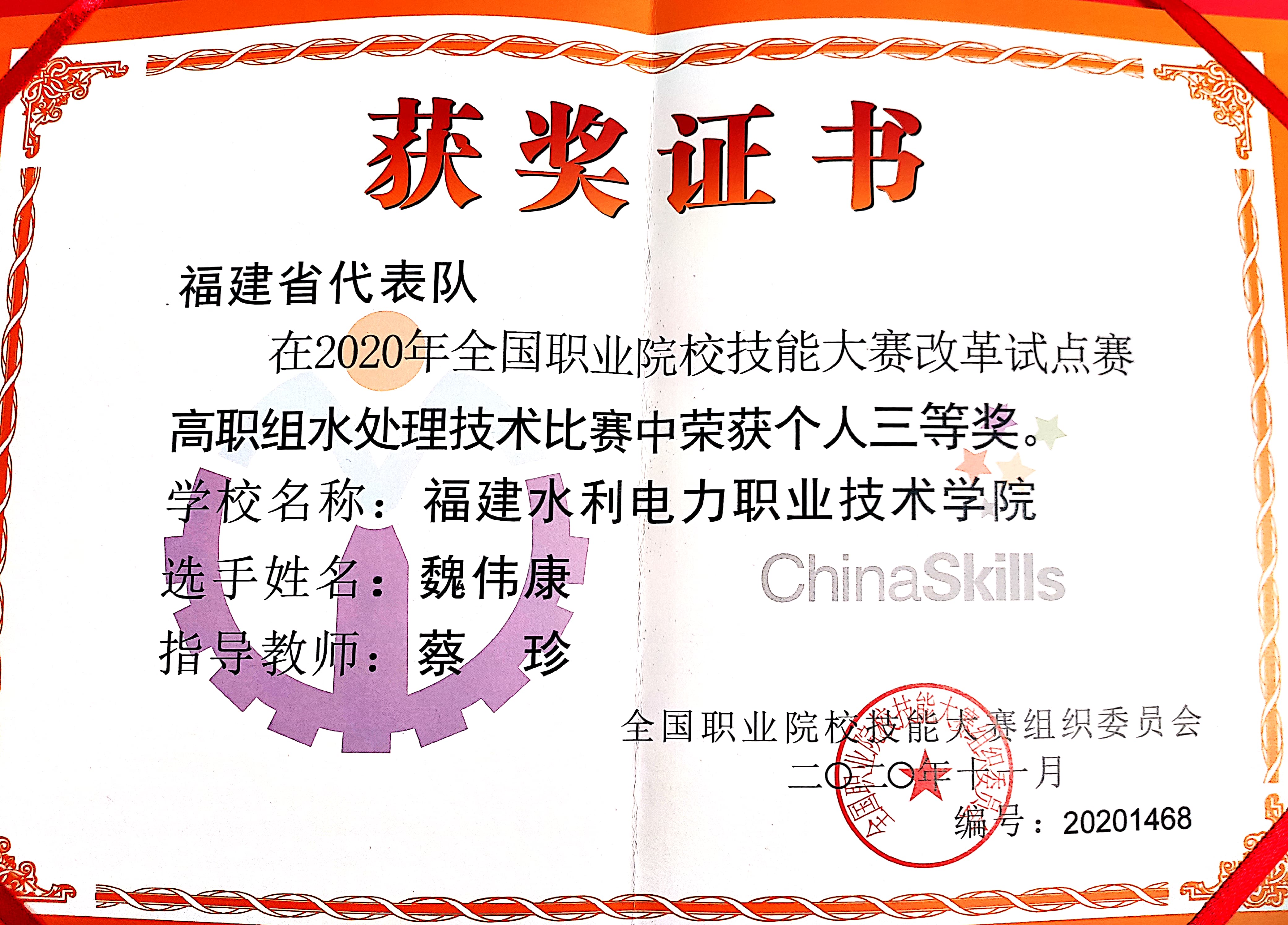 11月27-28日,2020年全国职业院校技能大赛改革试点赛高职组“水处理技术”赛项在山东科技职业学院举办,我院2018级学生魏伟康荣获三等奖。