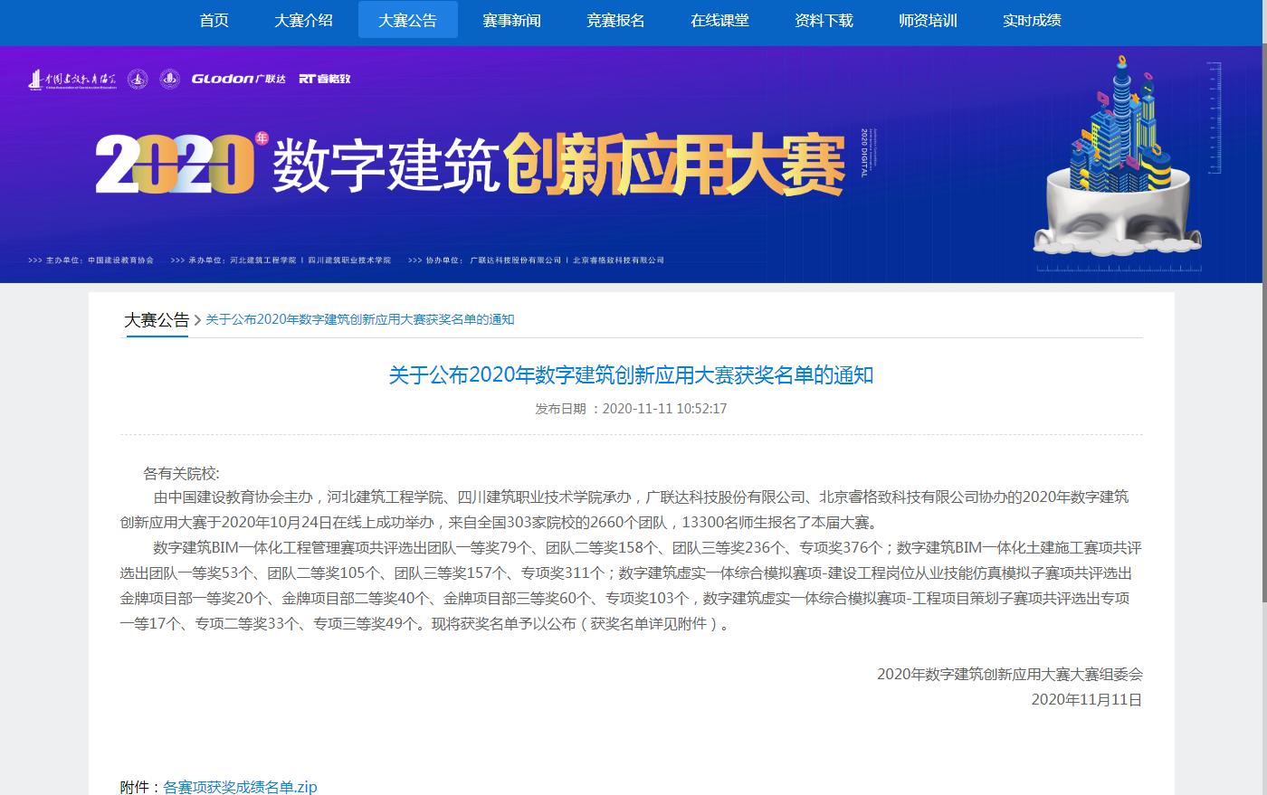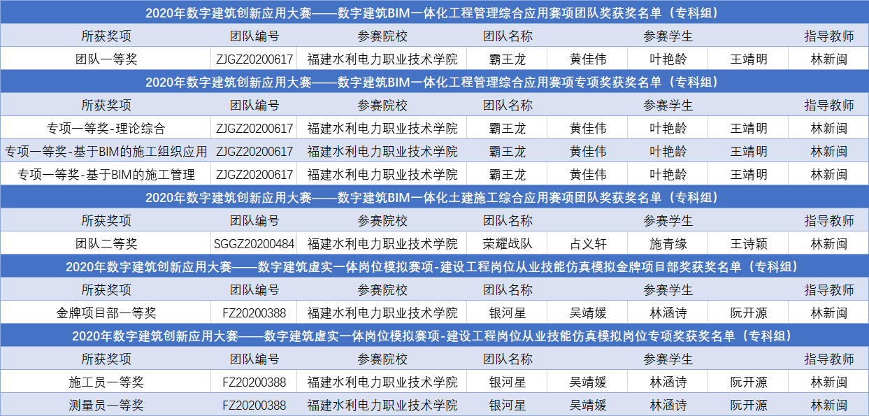近日,由中国建设教育协会主办,河北建筑工程学院、四川建筑职业技术学院承办的2020年全国高等院校数字建筑创新应用大赛结果出炉。我院学生在由建筑工程系林新闽、林张纪、詹述琦、林新梅、林丹组成的工程造价教师指导团队的指导下取得佳绩。其中,造价1835吴靖媛、造价1834阮开源、林涵诗同学荣获“建设工程岗位从业技能仿真赛项”金牌项目一等奖;造价1831叶艳龄和造价1834 黄佳伟、王靖明同学荣获BIM全过程造价管理赛项团体一等奖;造价1834 占义轩、施青缘、造价1832 王诗颖荣获BIM一体化土建施工赛项团体二等奖。