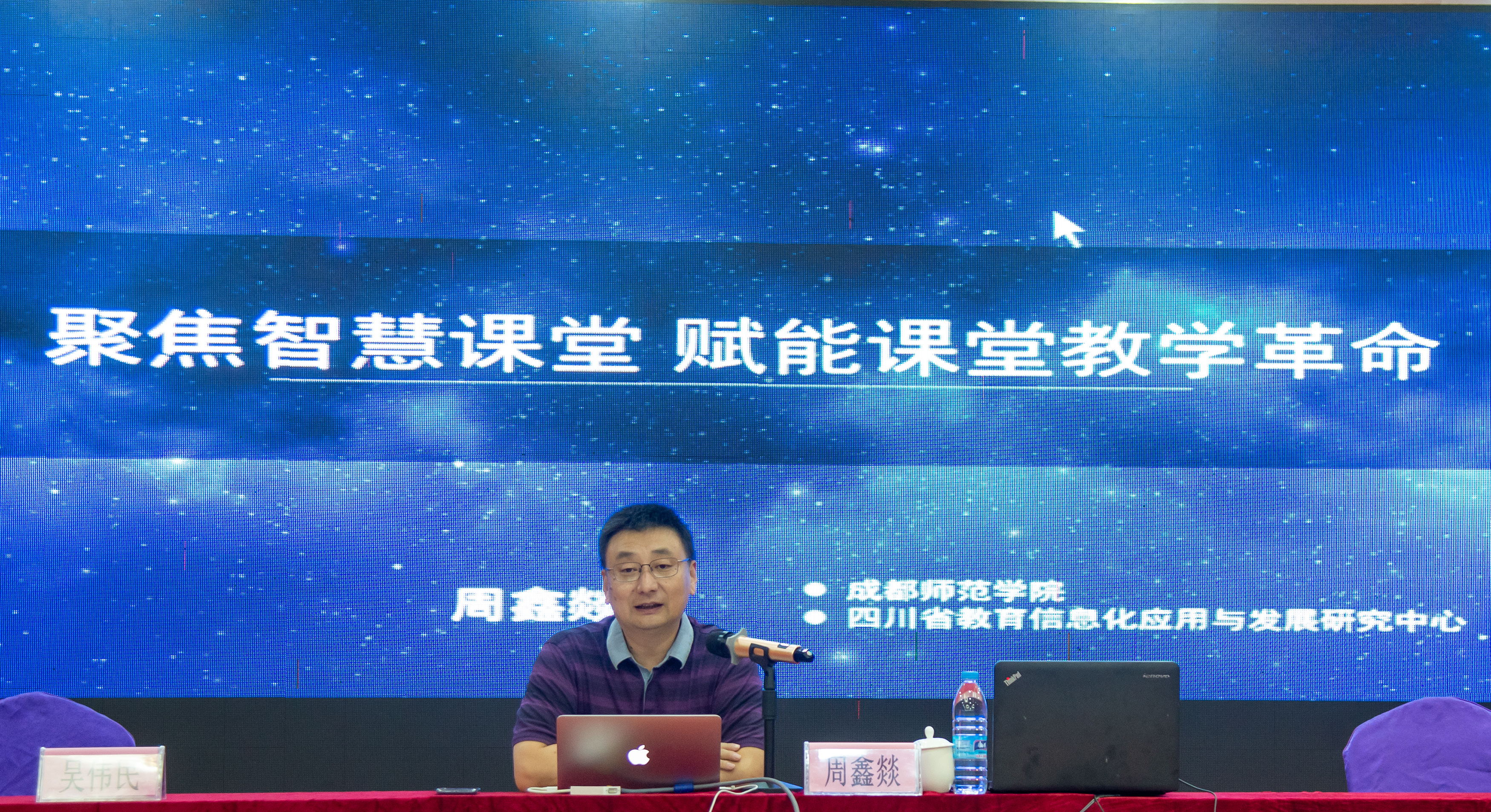 成都师范学院周鑫燚教授作《聚焦智慧教学,赋能课堂革命》专题讲座。他用十九大报告提出的“加快教育现代化”引出课堂革命的迫切需要,分别从“听懂号角——解读课堂教学革命”“智慧课堂——课堂革命的重要途径”“谨防上当——课堂教室的再认识”“‘金课’建设——智慧课堂的具体目标”等四个方面深入分析了智慧教学的内涵、实现途径以及具体目标。