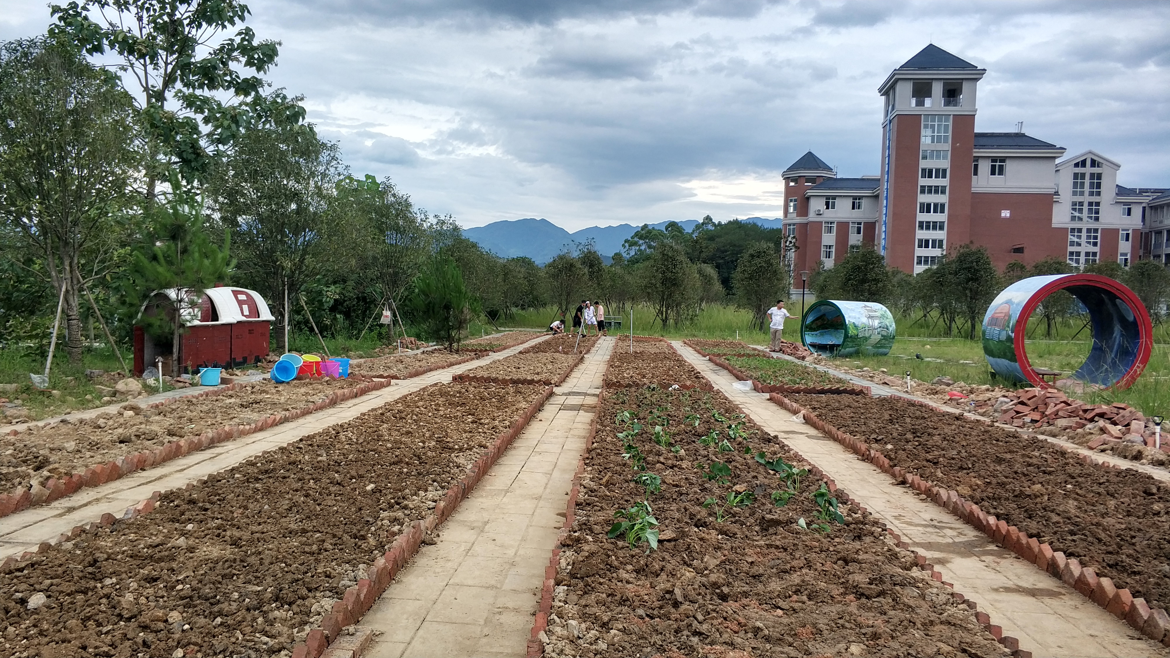 据了解,建筑工程系已完成劳动实践基地B区园艺作品展示区设计稿初选,下一步将进行放样施工。C区绿植休闲区的建设方案也在论证中,不久就可以开始施工建设。