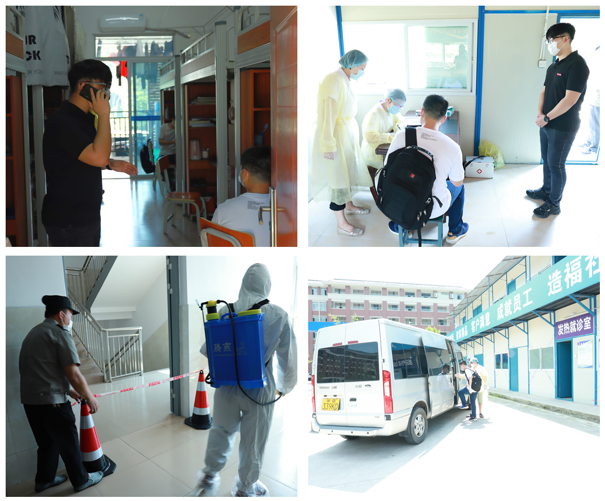 一位学生在每日晨检时发现体温异常,学生报告辅导员立即上报学院。120急救车到达宿舍区,接走学生送往医院就诊,立即隔离同楼层、同宿舍同学及该生的密切接触者。后勤人员对现场开展专业消杀。
