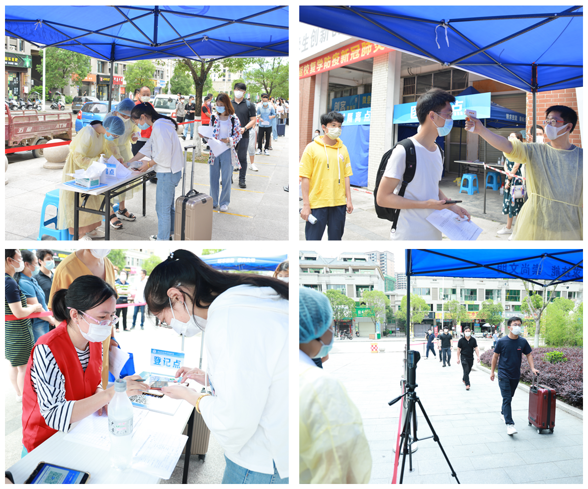 在学生返校报到演练现场,前来报到的“学生”带好口罩,自觉按照一米间距依次排队检测体温,出示身份证、学生证、八闽健康码,并填写提交疫情申报承诺书、健康登记表后正式入校。