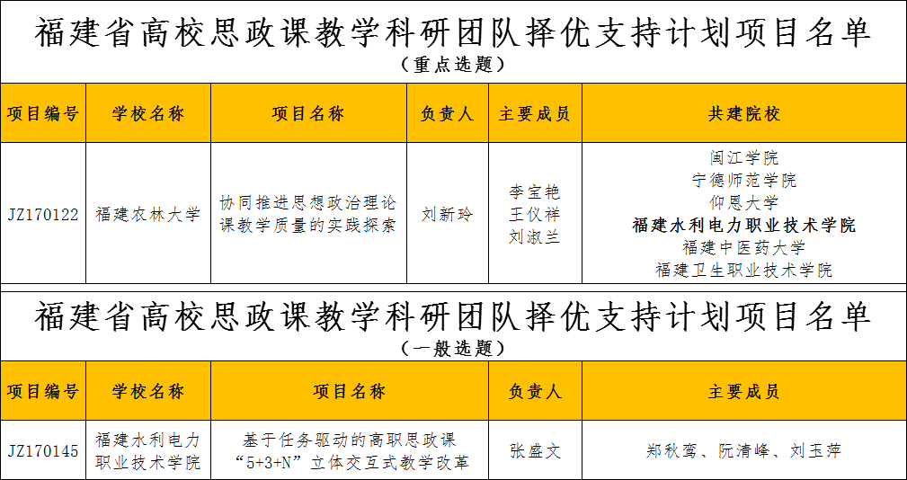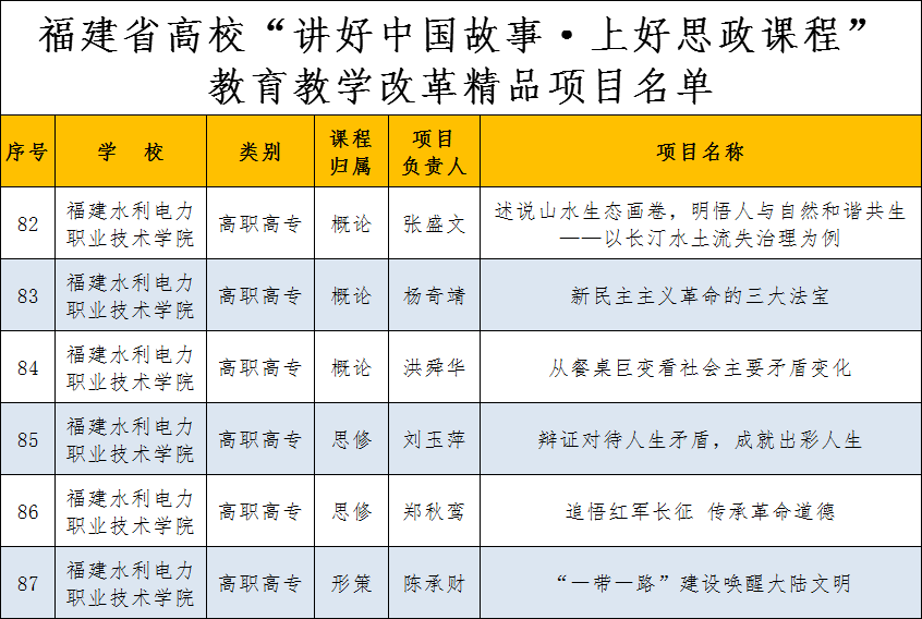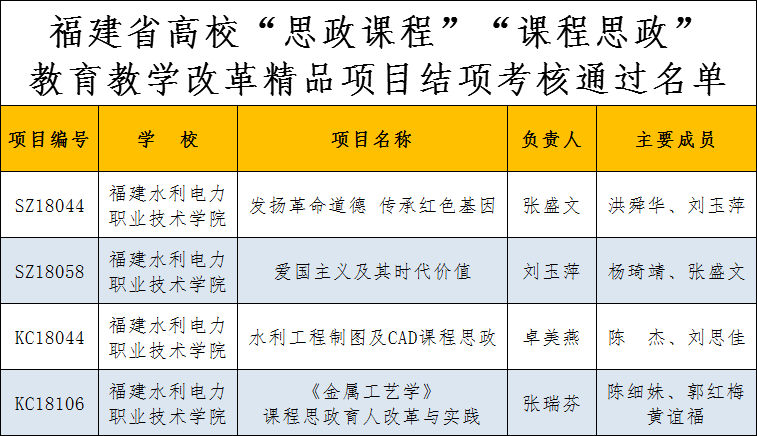 据《中共福建省委教育工委关于持续推进“讲好中国故事·上好思政课程”创优攻坚行动和思想政治理论课教学科研团队择优支持计划等工作的通知》(闽委教思〔2020〕6号)悉,我院有6个项目入选省高校“讲好中国故事·上好思政课程”教育教学改革精品项目名单,2个项目(其中1个为共建项目)入选省高校思政课教学科研团队择优支持计划项目名单,另有4个省高校“思政课程”“课程思政”教育教学改革精品项目通过结项考核。