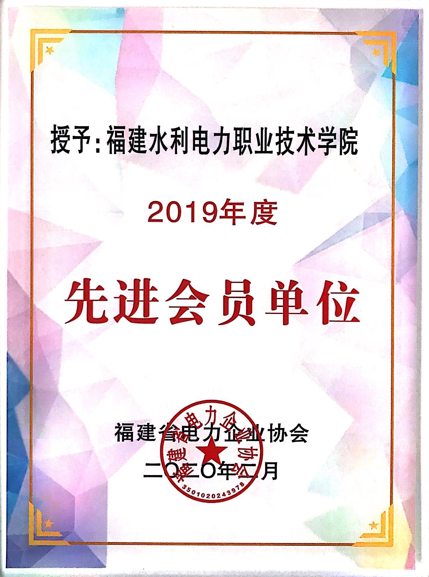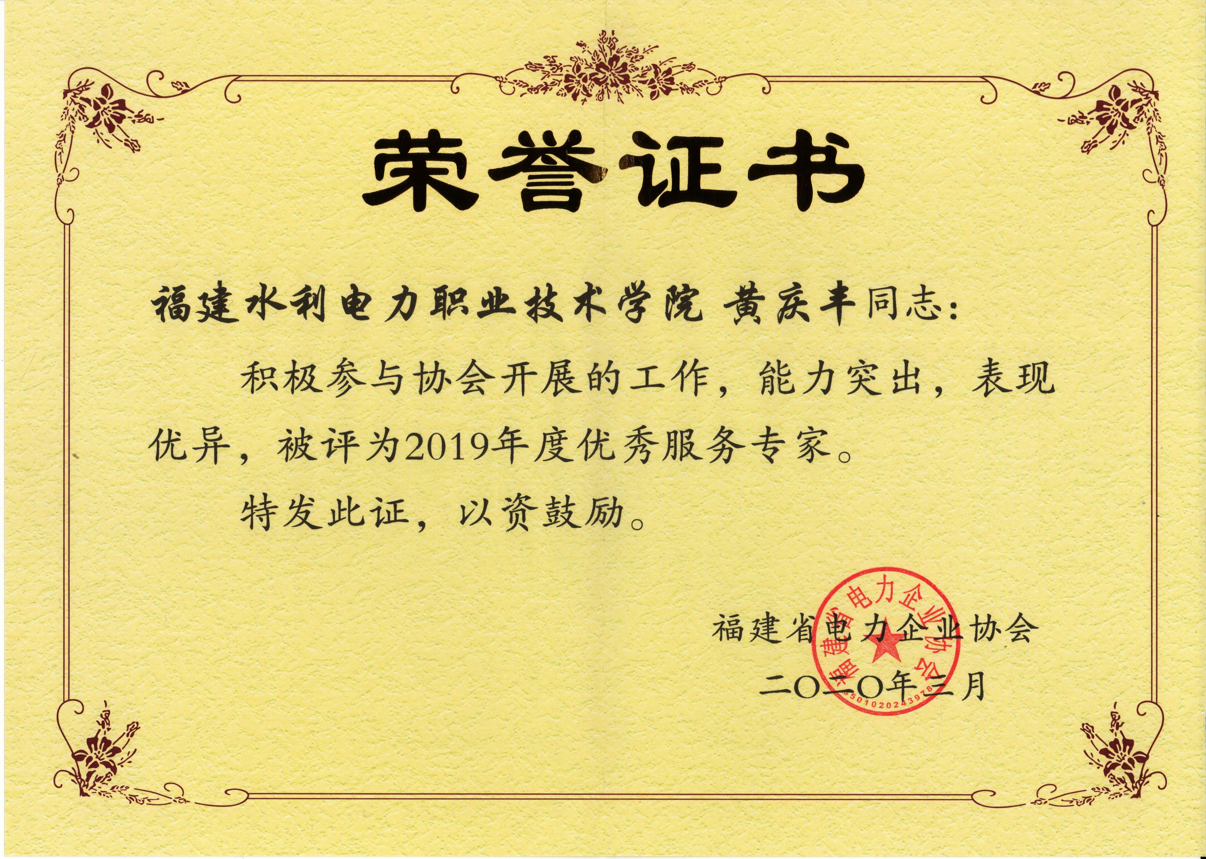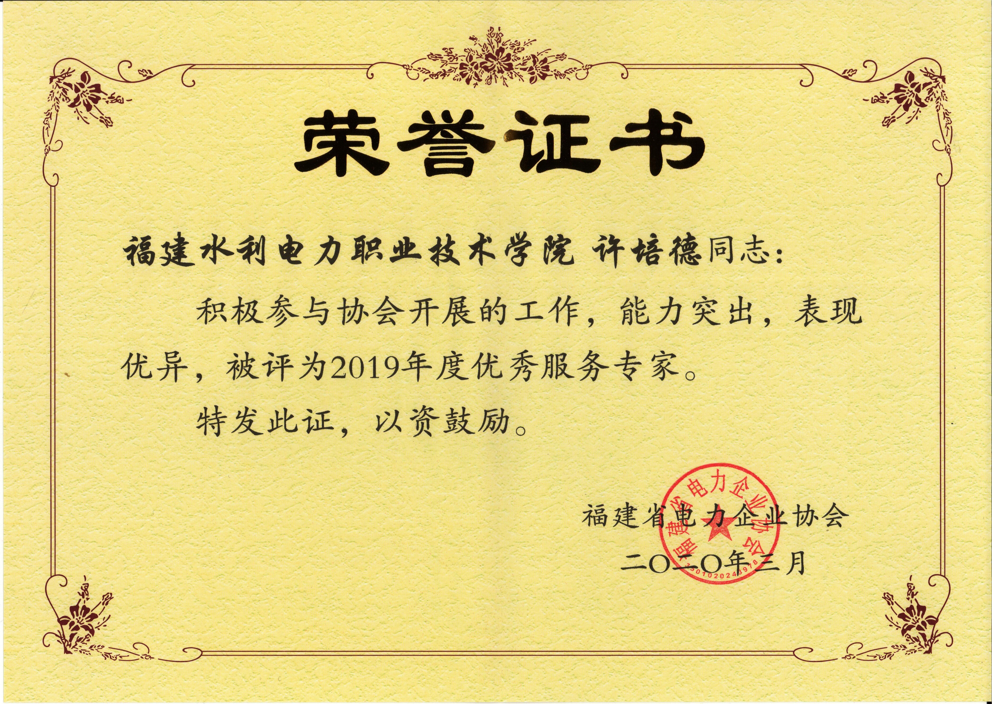 近日,我院荣获福建省电力企业协会授予的“2019年度先进会员单位”称号,电力工程系黄庆丰、许培德二位老师获得“2019年度优秀服务专家”称号。