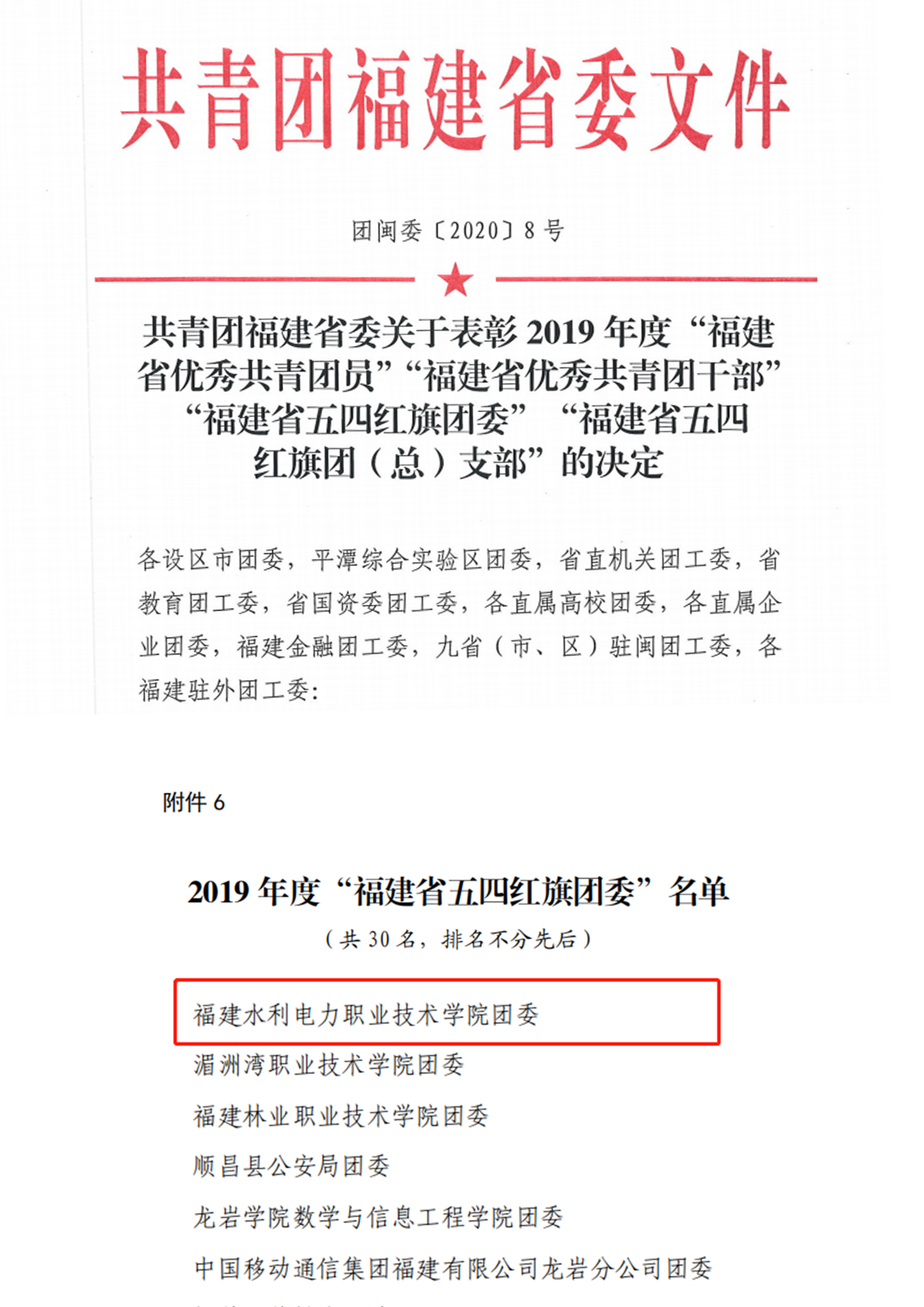 近日,共青团福建省委印发《关于表彰2019年度“福建省优秀共青团员”“福建省优秀共青团干部”“福建省五四红旗团委”“福建省五四红旗团(总)支部”的决定》,我院团委荣获2019年度“福建省五四红旗团委”荣誉称号。
