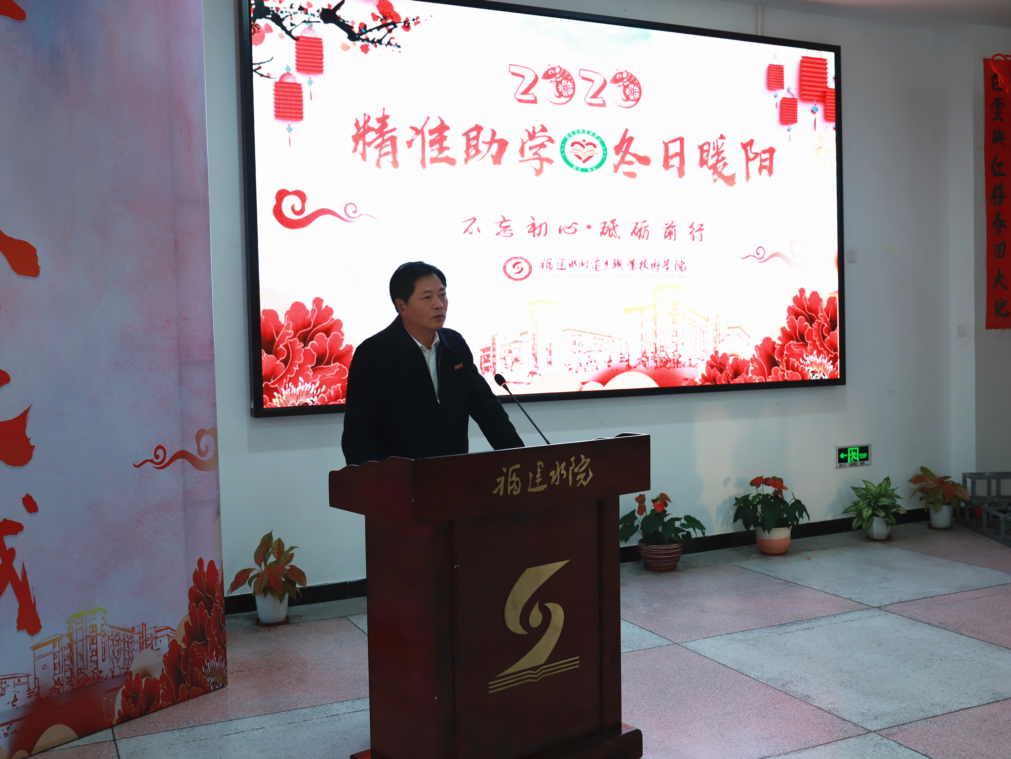 庄伟廉在活动中总结发言。他对贫困学子们通过努力获得国家励志奖学金、老师们为学生的成才而付出感到高兴,同时对学生们提出三点希望:一是要珍惜时间、珍惜学习机会、努力奋斗。现代职业教育技术的发展为我们创造成功成才的机会,社会对人才的需求也要求我们要珍惜时间,学好本领才能在社会上有一席之地,才能适应现代职业技术发展的需要;二是学院有爱生的传统。同学们要多与老师们交流沟通,在老师的关怀与教导中得到良好的启迪,为今后迈入社会奠定基础;三是学院不会落下任何一个有困难的学生。把困难告诉老师,要坚强面对困境。懂得奋进,激励成长,对暂时性困难的克服,也是对未来的历练。最后,庄伟廉对同学和老师们致以了新春的问候和祝福。