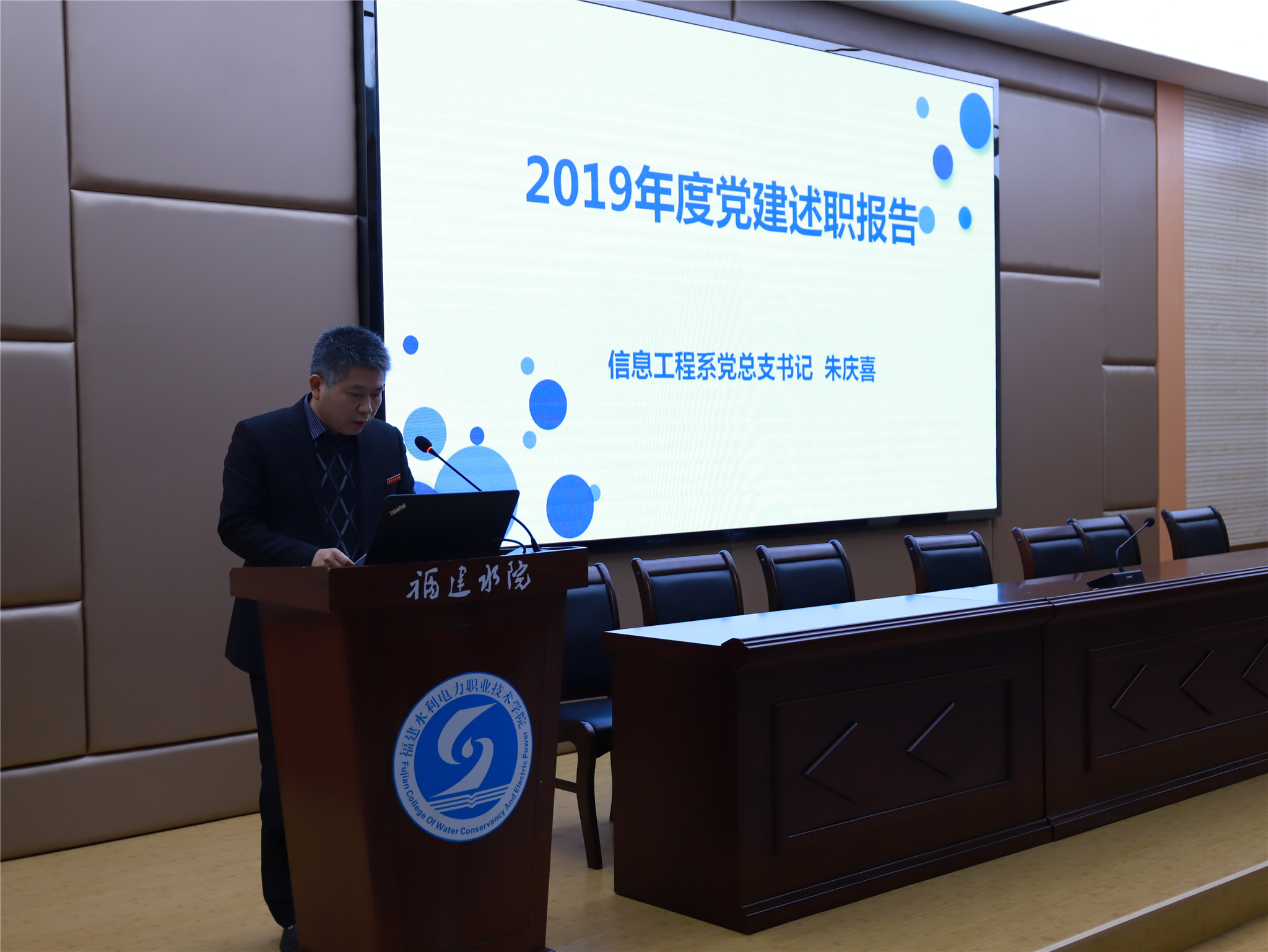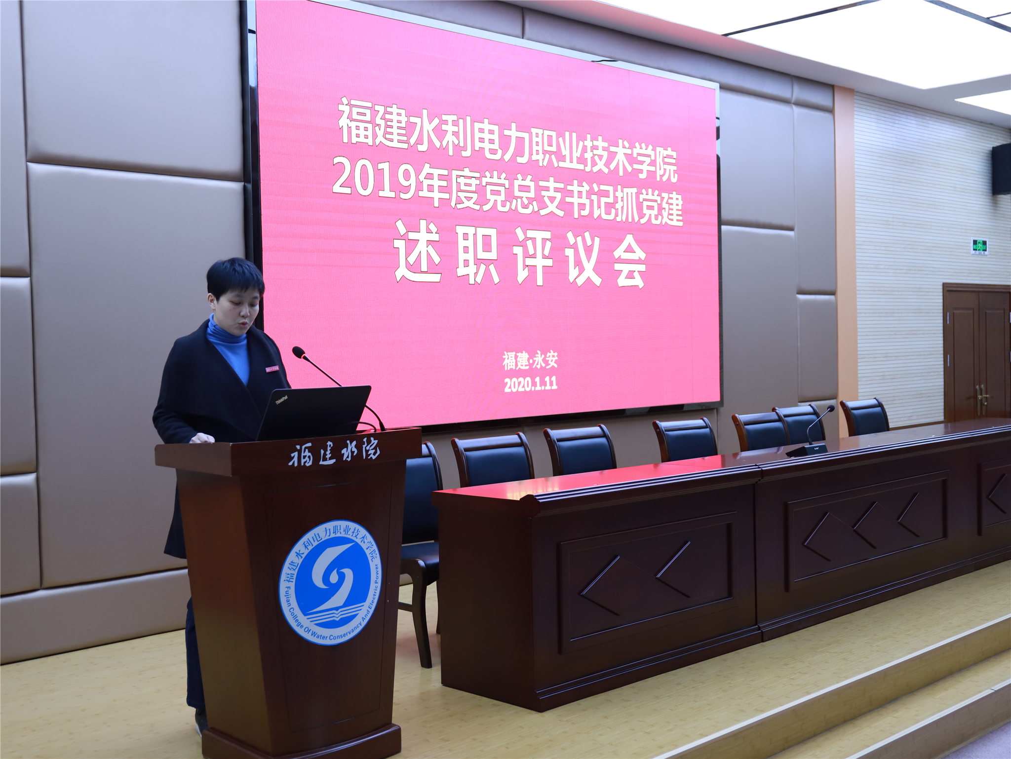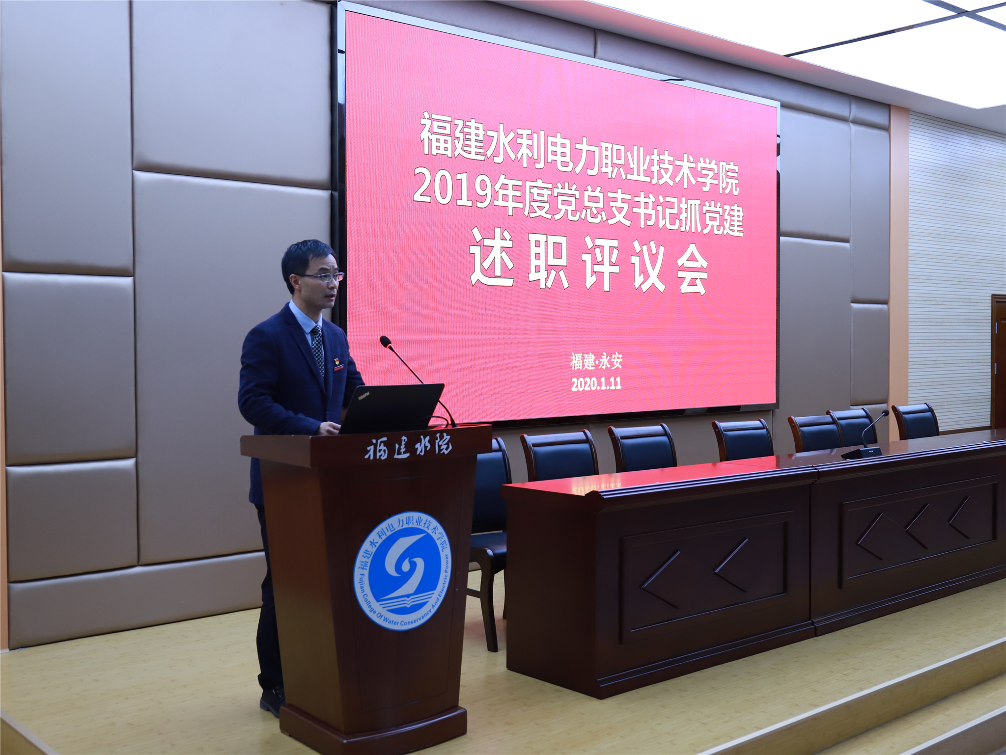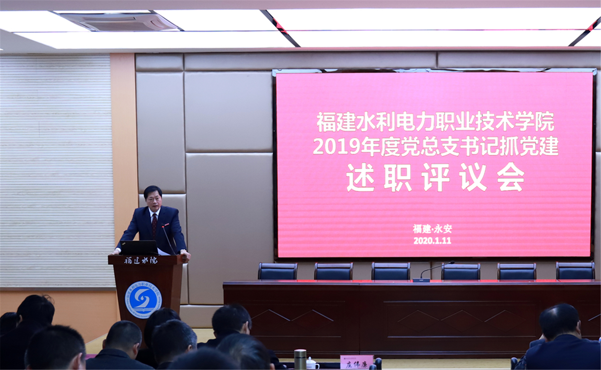 2020年1月11日下午,学院在禹兴园3-D01室召开2019年度党总支书记述职评议会议。学院领导,各部门负责人、党总支书记、团总支书记、专职组织员以及民主党派代表共计47人出席会议。会议由党工部部长刘玉萍主持。