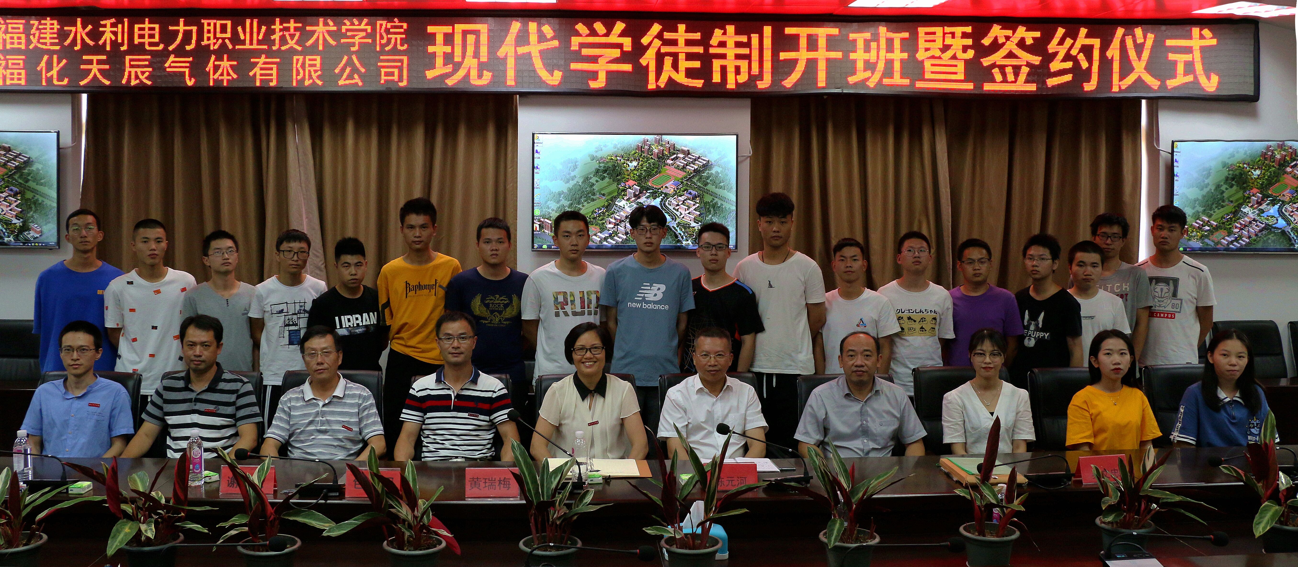 8月29日下午,福建水利电力职业技术学院与福化天辰气体有限公司现代学徒制开班暨签约仪式在禹兴园1-506顺利举行。学院党委副书记黄瑞梅,福化天辰党委委员、副总经理、工会主席陈元河,福化天辰人力资源办公室主任、党群办公室主任吴文忠,学院教务处处长包晓晖,机电工程系主任谢珍贵,机电工程系相关教师、专职辅导员和机电、水利、信息三系的现代学徒制班级同学们参加了签约仪式,仪式由机电工程系副主任兰嵩主持。