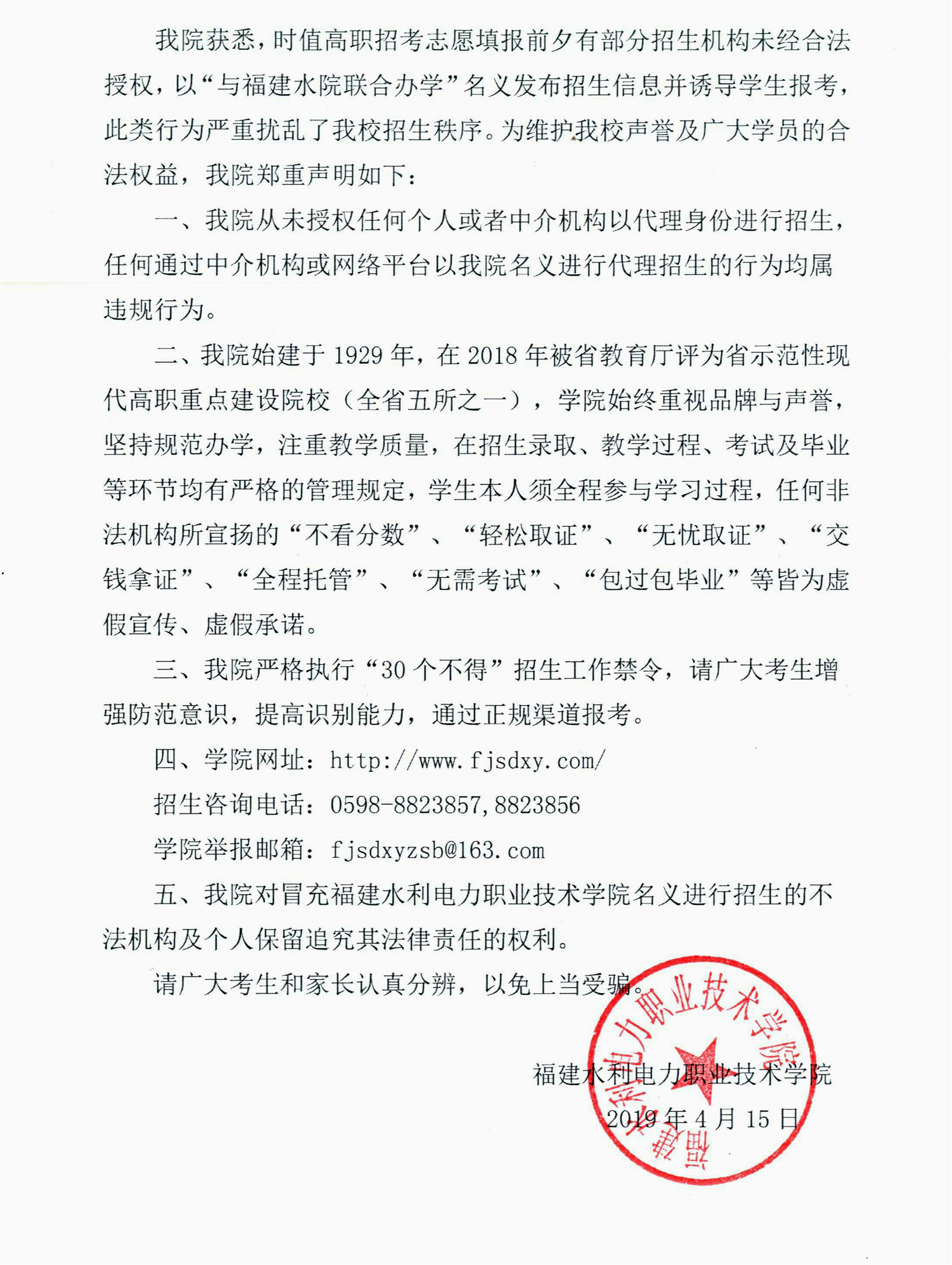 福建水利电力职业技术学院关于招生办学的郑重声明