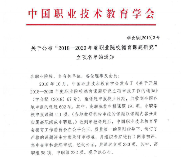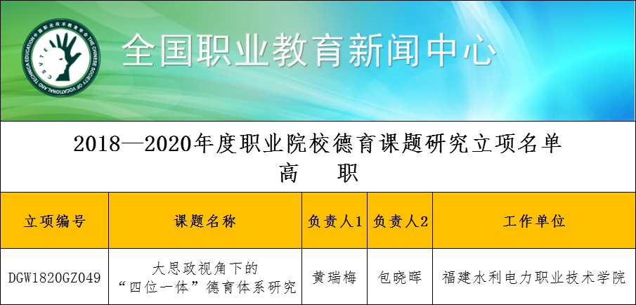 近日,中国职业技术教育学会公布了《2018—2020年度职业院校德育课题》立项名单(学会秘[2019]2号),由我院党委副书记黄瑞梅主持,教务处、马克思主义学院共同申报的《大思政视角下的“四位一体”德育体系研究》成功获批立项,系福建省入选的两个高职院校项目之一。