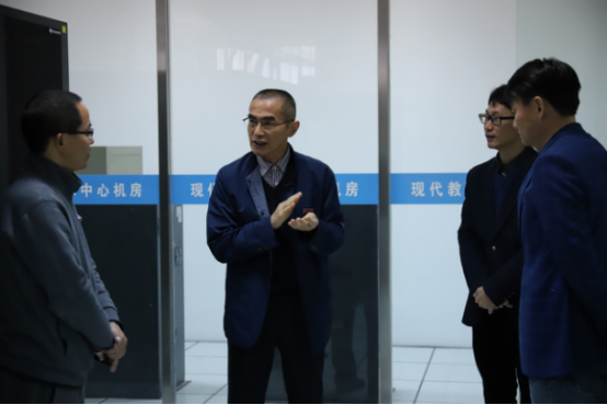 杨元挺一行首先参观了学院中心机房的改造工程,认真听取了相关部门对学院智能化(视频监控、背景广播、室外管网、光纤扩容)推进工作的汇报。调研过程中,杨元挺提出了几点指导性意见:一是视频监控系统关系校园平安全局,要做到校园安全无死角覆盖,监控指挥中心应能全方位监测到校园安全状况,要实现手机查看监控视频。二是背景广播系统作为校园文化重要的传播手段,要发挥意识形态领域的正面引导作用,要让曼妙的音乐给学院师生工作、学习之余感受到校园的温馨、宁静美。三是在规范、保障质量的前提下进一步完善监控指挥中心的设计,尽快推进项目建设,实现校园智慧环境的大提升。