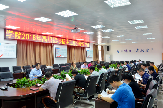 4月25日下午,学院在禹兴园1-506会议室召开2018年高职招考招生工作分析总结会,党委书记庄伟廉、院长杨元挺、党委副书记黄瑞梅、副院长李建平、池长全、杨武盖,各专业教学系党政负责人、各职能部门负责人以及招生办成员参加了会议,会议由副院长杨武盖主持。