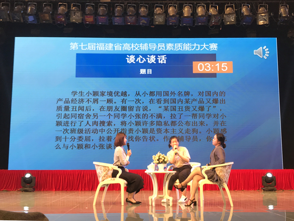 本届福建省高校辅导员职业能力大赛由中共福建省委教育工委主办,比赛设置笔试、案例分析、谈心谈话、理论宣讲等环节,是我省高校辅导员系列最高层次的技能竞赛平台,考察辅导员从理论到实践、从思想到行为等方面的素质。