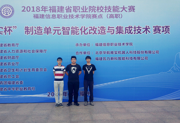 近日,2018年福建省职业院校“制造单元智能化改造与集成技术”项目技能大赛在福建信息职业技术学院举行,来自全省12所院校的36名选手参加了该项竞赛。经过2天的激烈角逐,我院机电系智控1531班吴敏敏、电气1631班沙游皖闽、电气1632班朱有华三位同学在兰嵩、罗钶两位老师的精心指导下喜获团体第二名,获得参加国赛资格。